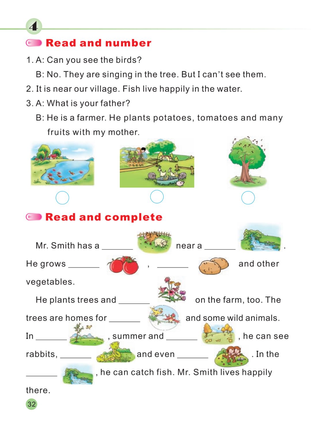 No. They are singing in the tree.Fish live happily in the water.He plants potatoes, tomatoes and many fruits with my mother.Mr. Smith has a farm near a river.He grow tomatoes, potatoes He plants trees and flowers for birds and some wild animals.In spring, summer and autumn, he can see rabbits, snakes In the river, he can catch fish.Mr. Smith lives happily there.