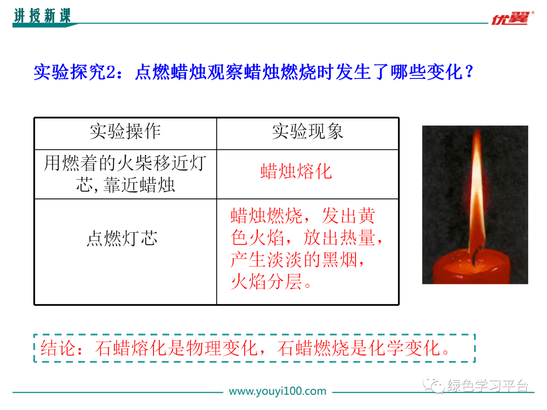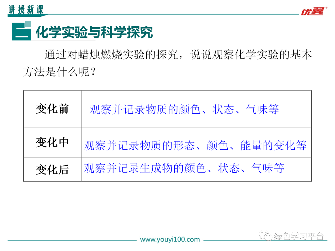 [讲解]化学是一门以实验为基础的学科,许多化学概念、化学基础知识都是通过实验形成的,因此必须学会观察实验的方法。下面请大家观察几个演示物质变化的实验,主要观察变化前后物质的颜色、状态,列表记录。