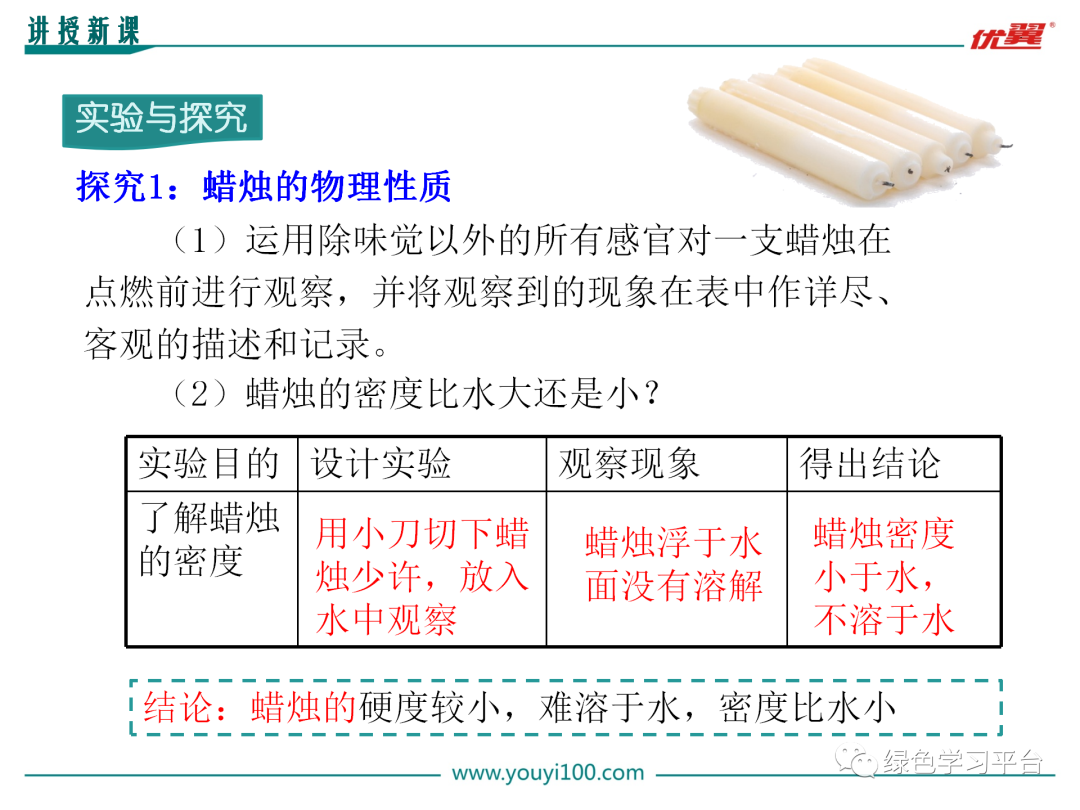 [过渡]物质在化学变化中表现出来的性质叫做化学性质。物质不需要发生化学变化就表现出来的性质叫做物理性质。