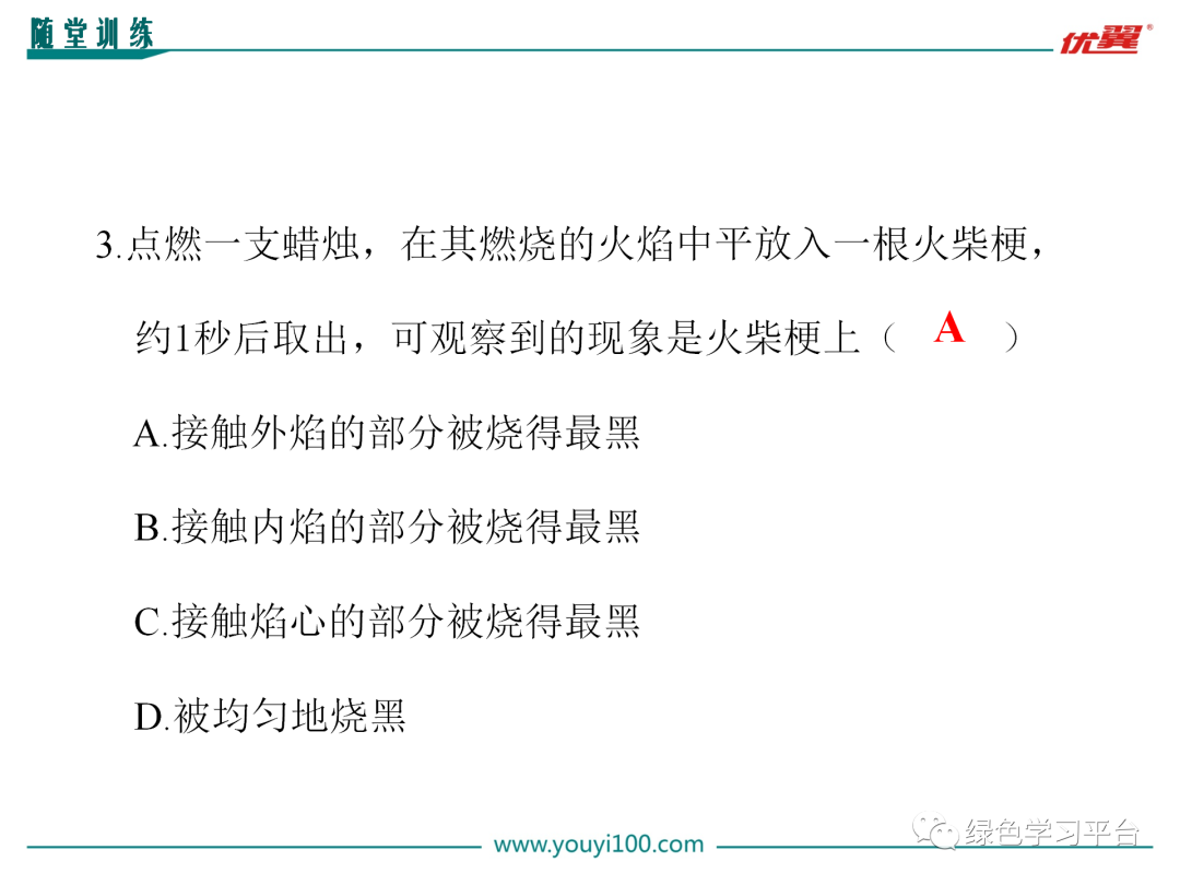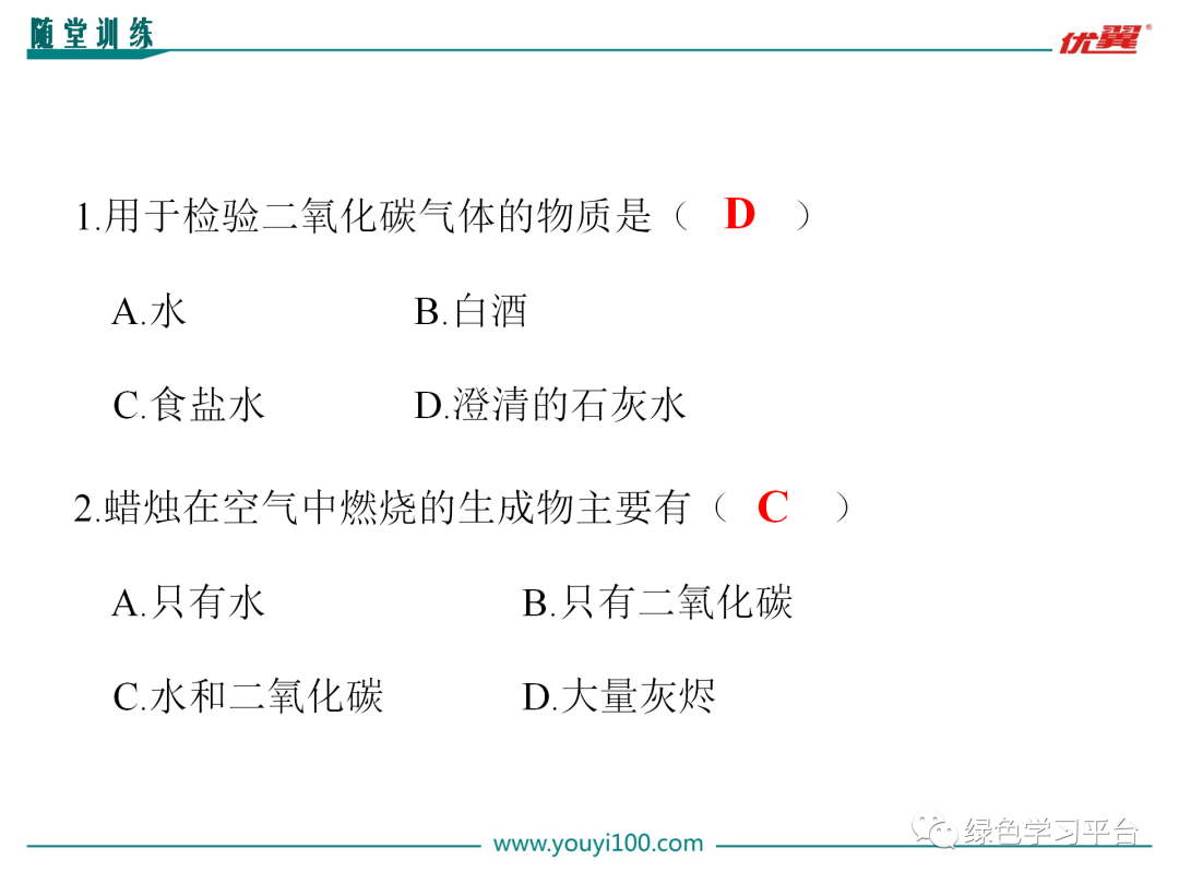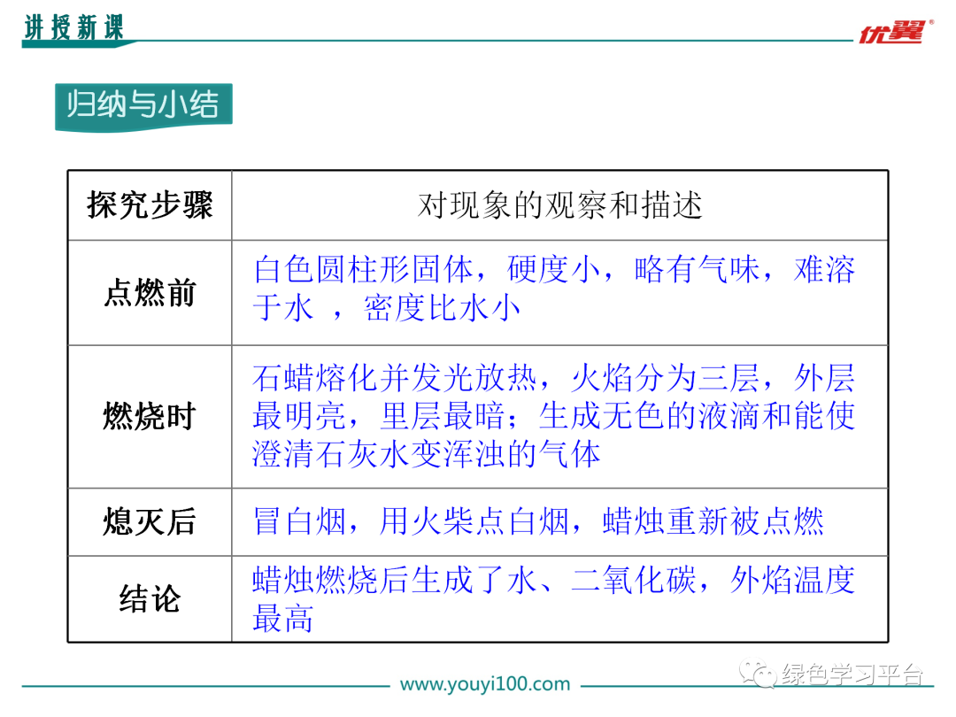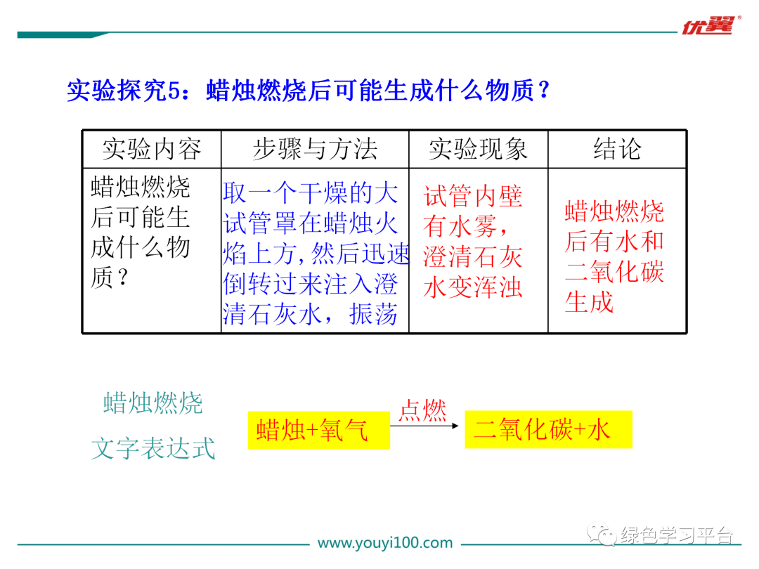 [讲解]物质的变化能体现其性质,反过来我们知道了物质的性质,就可以推断其会发生怎样的变化,进而应用物质。如我们知道二氧化碳不支持燃烧,也不能燃烧就可用它灭火;知道酒精有可燃性,就可以用它来做燃料。以后大家学习物质要把它的性质、变化和用途结合起来。