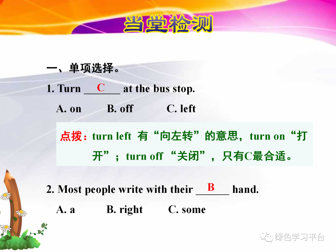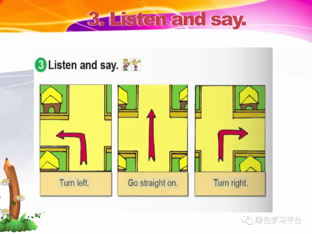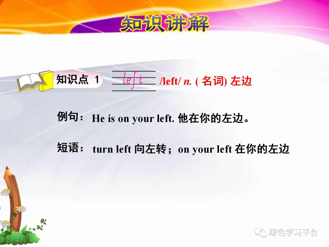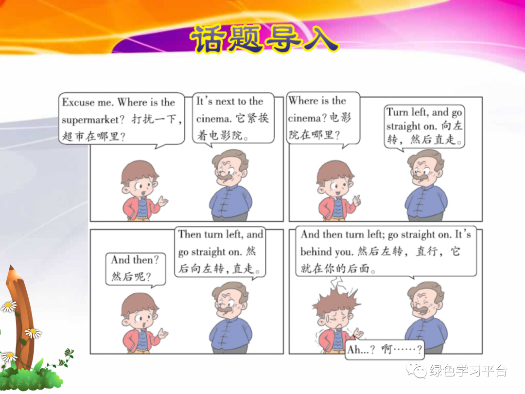 T: Is the school on my left ? (学生听不懂,用中文翻译一遍)
