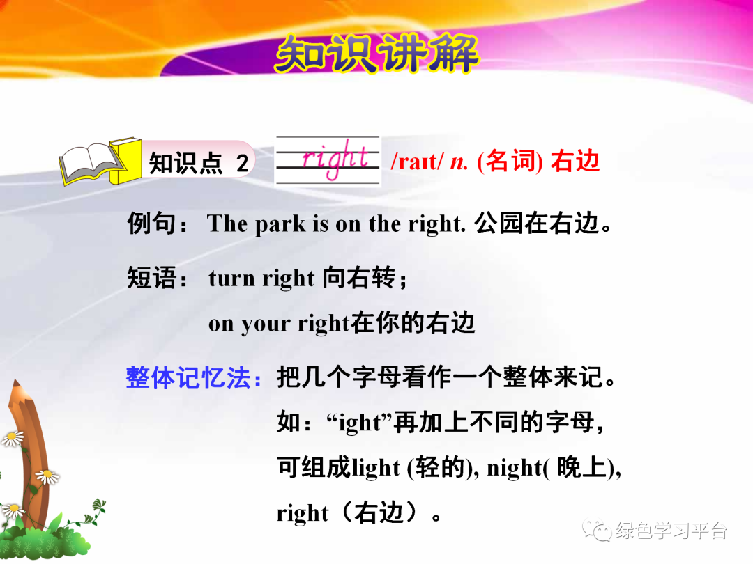 (教学意图:以情境引入教学,并使用多媒体课件辅助,更易使学生快速进入学习意境,以听指的方法来复习学过的单词,既巩固了旧知,又自然地引出了新知:left / right )