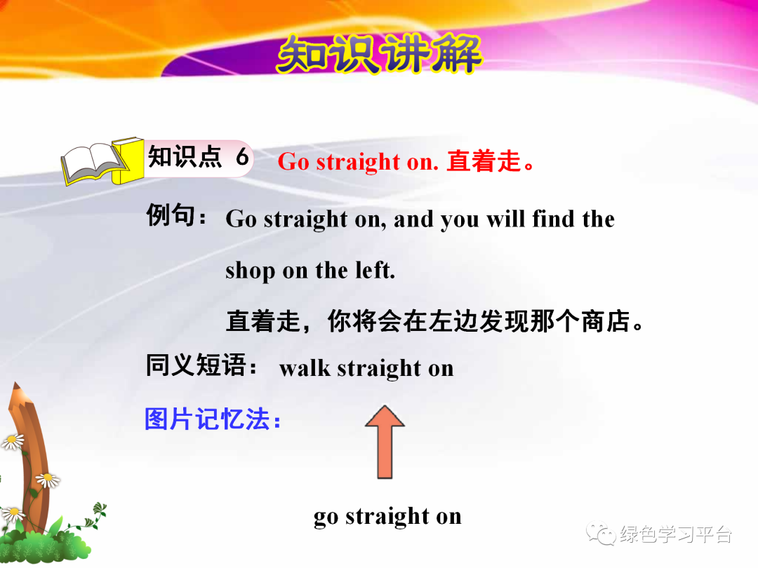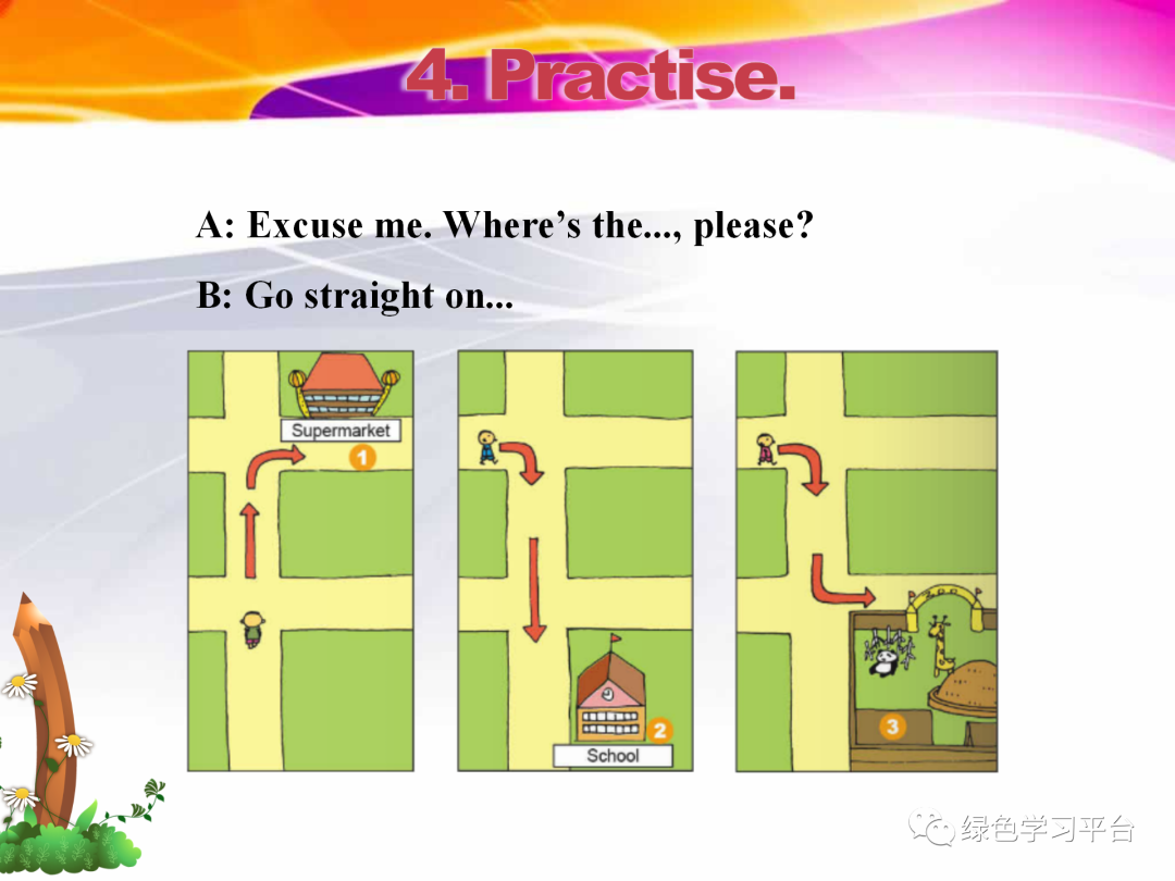 Show a map and ask the Ss : " If I want to go to the KFC , how can I go there ? " (学生用中文回答: 向前直走)教师给予肯定并用英语说: Go straight on. 并做相应的肢体动作。