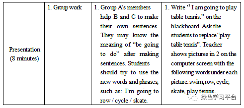 通过Michael和Kangkang的对话,呈现了本课所要学的语法重点:将来时be going to do结构。结合本单元的话题Playing Sports, 呈现了重点短语:play basketball/football, have a basketball/football game, cheer … on, win (the game), prefer doing等。Playing Sports这个话题和学生们的生活紧密相连,容易激发学生的学习兴趣。但要正确使用be going to do对学生来说还是有一定困难的。困难一:be动词和主语不一致(多数学生);困难二:不会正确地将do替换成具体动词(少数学生)。所以,要求老师以课本文本内容为依据,结合学生的实际生活,引导学生正确地使用be going to do谈论自己的运动计划,并能用书面表达形式写出自己的运动计划。