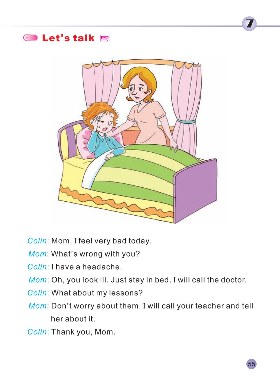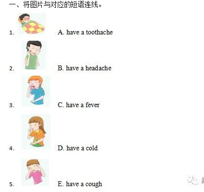获取配套课件教案习题试卷请拉到文末课文朗读♬点击上方绿标听课文朗读微课讲解微课教学电子课本点击预习:新陕旅版英语五年级下册电子课本课文翻译Unit 7 I have a headache第七单元 我头疼Think and tick想一想,并打勾 1.Do you often go to see a doctor?你经常去看医生吗? 2.When do you go to see a doctor?你什么时候去看医生? Think and answer想一想,并回答 Do you want to be a doctor?你想当医生吗?Why or why not?为什么?为什么不?Let's learn学一学 have a coldhave a coughhave a feverhave a headachehave a toothachehave a stomachachesee a doctor感冒咳嗽发烧头疼牙疼胃疼看医生Let's talk说一说 Mom, I feel very bad today.妈妈,我今天觉得很不舒服。What's wrong with you?你怎么了?I have a headache.我头疼。 Oh, you look ill.哦,你看上去是病了。Just stay in bed.就待在床上吧。I will call the doctor.我给医生打电话。 What about my lessons?我的课怎么办?Don't worry about them.别担心。I will call your teacher and tell her about it.我会给你的老师打电话告诉她的。Thank you, Mom.谢谢你,妈妈。同步习题二、把下列短语翻译成汉语。1. have a fever______________ 2. have a cough_______________3. have a headache_____________ 4. see a doctor________________5. have a toothache____________ 6. have a cold________________7. have a stomachache__________________三、翻译下列句子。1. Do you often go to see a doctor?___________________________________2.When do you go to see a doctor?___________________________________3.I have a headache. ___________________________________参考答案:一、1—C 2—A 3—D 4—E 5—B二、1. 发烧 2. 咳嗽 3. 头痛 4. 看医生 5. 牙疼 6. 感冒 7. 肚子疼三、1. 你经常看医生吗? 2. 你什么时候看医生? 3. 我头痛。怎么获取配套课件教案习题试卷等资料?▼下载方法(务必细看):关注微信公众订阅号【绿色学习平台】(ID:qqyu_520910),在公众号底部菜单中输入下面提示关键字,正常一分钟内即可下载。特别注明:1、如提取不了说明关键字输入错误或操作不当,可以留言等待处理。2、我们不做强制分享获取,但希望你获取资料后还能常来,能帮我们转发分享。3、来了就是朋友,多提意见和建议。 领取方法1 ▼第1步:扫码关注 绿色学习平台第2步:发送关键字【052】即可获取。如有疑问,请添加卿老师微信:yzy5200426。(请按照正确的关键字回复哦,不添字,不错字,不漏字,否则系统无法识别) 领取方法2 ▼打不开百度网盘链接的地区可长按扫码直接进入下载电脑端下载网址http://jazpan.com/view/22809.html▼(回复关键词位置如下图所示)图文来自网络,版权归原作者,如有不妥,告知即删点击阅读原文下载全册PPT课件动画教案习题朗读试卷电子课本整套资料