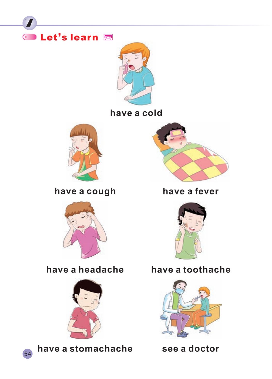 have a cough have a fever have a headache have a toothache have a stomachache see a doctor | 感冒 咳嗽 发烧 头疼 牙疼 胃疼