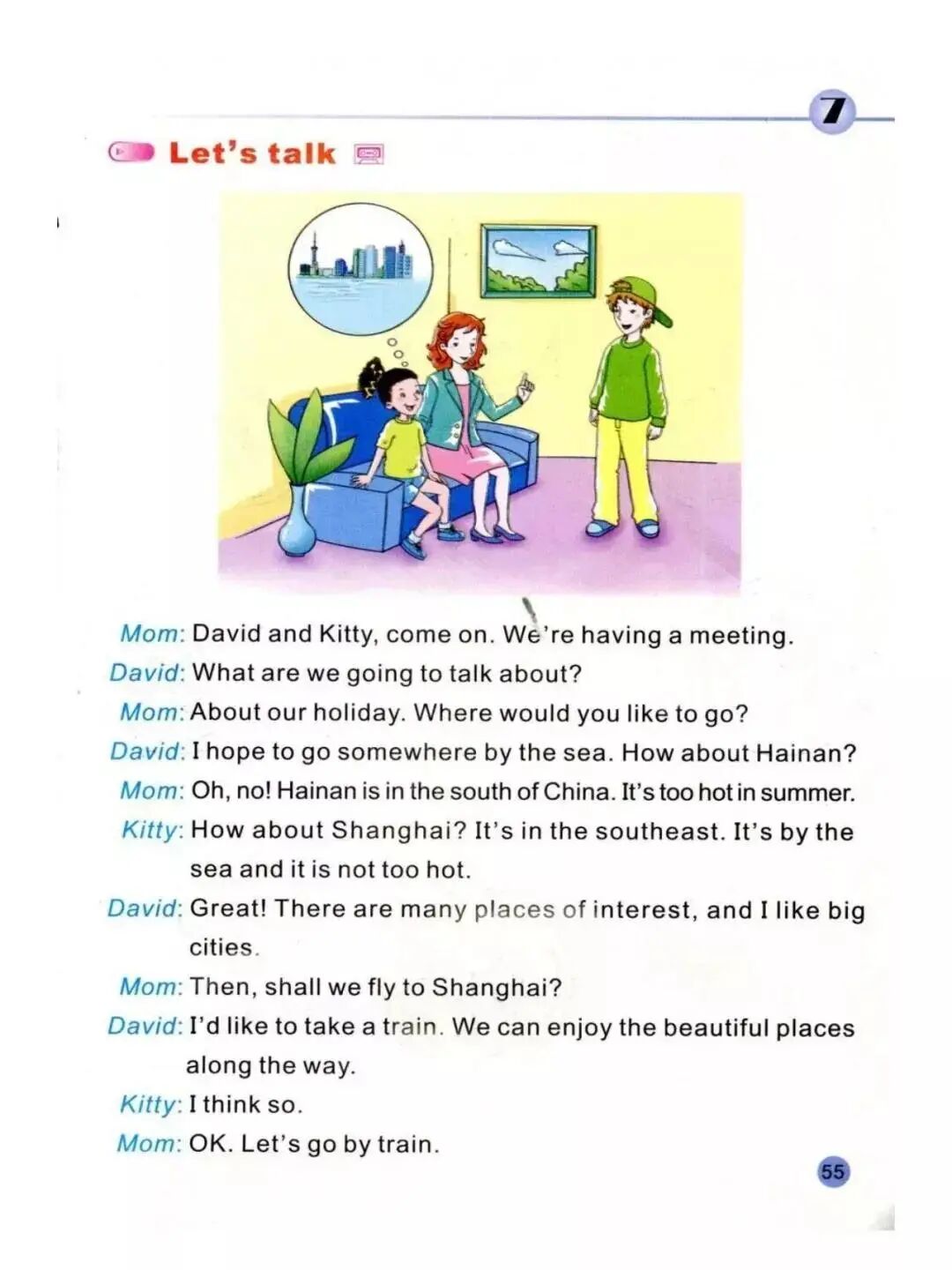 David and Kitty, come on.What are we going to talk about?Where would you like to go?Hainan is in the south of China.It's by the sea and it is not too hot.There are many places of interest,Then, shall we fly to Shanghai?I'd like to take a train.We can enjoy the beautiful places