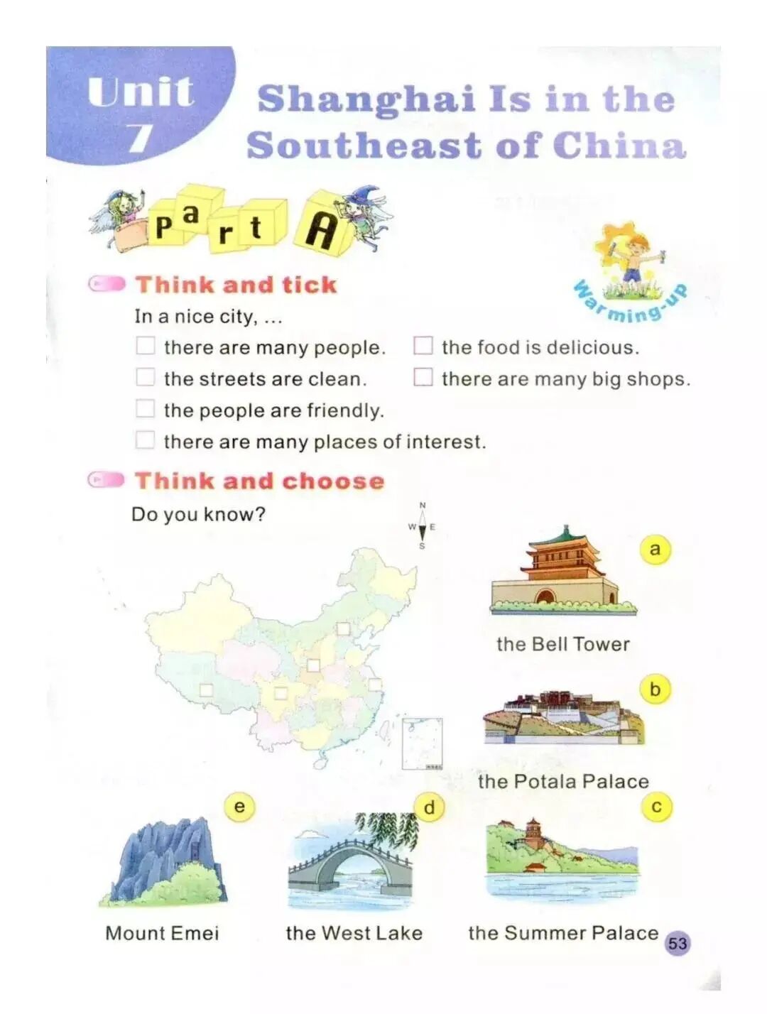 获取配套课件教案习题试卷请拉到文末课文朗读♬点击上方绿标听课文朗读微课讲解微课教学电子课本点击预习:新陕旅版英语六年级下册电子课本课文翻译Unit 7Shanghai is in the southeast of China第七单元 上海在中国的东南部Think and tick想一想,并打勾 In a nice city ...在一个美丽的城市...... there are many people. 有很多人。the streets are clean. 街道很干净。the people are friendly.人们很友好。there are many pieces of interest.有许多有趣的东西。 the food is delicious.这食物很好吃。there are many big shops.有许多大商店。 Think and choose想一想,选一选 Do you know?你知道吗? the Bell Towerthe Potala Palacethe Summer Palace the West Lake Mount Emei钟楼布达拉宫颐和园西湖峨眉山Let's learn学一学 north北;北方northwest西北northeast东北west西;西方east东;东方southwest西南southeast东南南;south南方Let's talk说一说 David and Kitty, come on.戴维、凯蒂,过来。We're having a meeting.我们开个会。What are we going to talk about?我们要讨论什么?About our holiday.关于我们的假期。Where would you like to go?你们想去哪里?I hope to go somewhereby the sea.我希望去海边的某地。How about Hainan?海南怎么样?Oh, no!哦,不!Hainan is in the south of China.海南在中国的南部。It's too hot in summer.夏天那儿太热了。 How about Shanghai?上海怎么样?It's in the southeast.它在东南部。It's by the sea and it is not too hot.在海边而且天气不是很热。 Great!太好了!There are many places of interest,那里还有许多名胜古迹,and I like big cities.而且我喜欢大城市。 Then, shall we fly to Shanghai?那么我们坐飞机去上海吗?I'd like to take a train.我想坐火车。We can enjoy the beautiful placesalong the way.我们可以欣赏沿途的美丽地方。I think so.我也是这么想的。OK. Let's go by train.好吧。我们坐火车去。同步习题一、汉译英。1.在……的北面______________ 2.在……的西面______________3.在……的南面_______________ 4.在……的东面______________5.西北_______________ 6.东北_______________7.西南_______________ 8.东南_______________二、单项选择。( ) 1. Shanghai is _________ China.A. in the southeast of B. in the northeast of( ) 2. — Where is Hebei? — _________. A. It’s in the north of China. B. It’s in the north China.( ) 3. — _________did you go last summer? — I went to Beijing. A. Where B. Why( ) 4. Heilongjiang is_________ China. A. in the northwest of B. in the northeast of三、填上合适的介词。1. Hainan is _________ the south of China. 2. I hope to go somewhere _________ the sea.3. How _________ Shanghai?四、连词成句。1.the,Hainan,in,China,south,is,of(.)_____________________________________________2.China,in,west,It’s,of,the(.)_____________________________________________3. is,Kun,Ming,Where(?)_____________________________________________参考答案:一、1.in the north of 2.in the west of3. in thesouth of 4. in the east of5.northwest 6. northeast7.southwest 8. southeast二、1. A 2. A 3. A 4. B三、1. in 2. by 3. about 四、1. Hainan is in the south of China.2. It’s in thewest of China.3. Where isKun Ming?怎么获取配套课件教案习题试卷等资料?▼下载方法(务必细看):关注微信公众订阅号【绿色学习平台】(ID:qqyu_520910),在公众号底部菜单中输入下面提示关键字,正常一分钟内即可下载。特别注明:1、如提取不了说明关键字输入错误或操作不当,可以留言等待处理。2、我们不做强制分享获取,但希望你获取资料后还能常来,能帮我们转发分享。3、来了就是朋友,多提意见和建议。 领取方法1 ▼第1步:扫码关注 绿色学习平台第2步:发送关键字【061】即可获取。如有疑问,请添加卿老师微信:yzy5200426。(请按照正确的关键字回复哦,不添字,不错字,不漏字,否则系统无法识别) 领取方法2 ▼打不开百度网盘链接的地区可长按扫码直接进入下载电脑端下载网址http://jazpan.com/view/22806.html▼(回复关键词位置如下图所示)图文来自网络,版权归原作者,如有不妥,告知即删点击阅读原文下载全册PPT课件动画教案习题朗读试卷电子课本整套资料