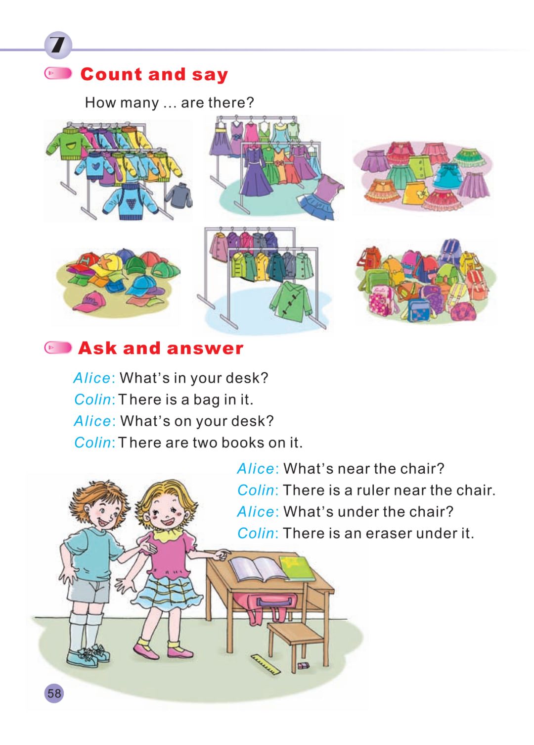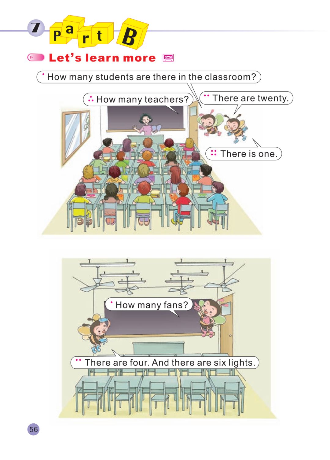 获取配套课件教案习题试卷请拉到文末课文朗读♬点击上方绿标听课文朗读微课讲解微课教学电子课本点击预习:新陕旅版英语三年级下册电子课本课文翻译Let's learn more学习更多 How many students are there in the classroom?教室里有多少学生? There are twenty.有二十名。 How many teachers?有多少老师?There is one.有1名。 How many fans?有多少风扇?There are four.有4个。And there are six lights.有六盏灯。Let's count我们来数数eleventwelvethirteenfourteenfifteen1112131415sixteenseventeeneighteennineteentwenty1617181920Count and say数一数说 How many?多少? Ask and answer问与答 What’s in your desk?你的书桌里有什么?There is a bag in it.里面有一个袋子。 What’s on your desk?你桌子上有什么?There are two books on it.上面有两本书。 What’s near the chair?椅子附近有什么?There is a ruler near the chair.椅子附近有一把尺子。 What’s under the chair?椅子下面是什么?There is an eraser under it.下面有一块橡皮。同步习题一、选出不同类的一项。( )1.A.light B.desk C.classroom( )2.A.school B.teacher C.student( )3.A.fan B.chair C.white( )4.A.what B.whose C.water( )5.A.blackboard B.candy C.door二、根据问句选择合适的答语。( )1. How many pens do you have?A. I have three pens. B. Please count the pens.( )2. What color is this sweater?A. It’s black.B. It’s a book.( )3. What’s in your desk?A. There is a bag in it.B. It’s a ruler.( )4. How many students are there in your class?A. There is one.B. There are twenty.( )5. Where is my book?A. It’s under the desk. B. There is a TV.参考答案:一、1. C 2. A 3. C 4. C 5. B 二、1. A 2. A 3. A 4. B 5. A怎么获取配套课件教案习题试卷等资料?▼下载方法(务必细看):关注微信公众订阅号【绿色学习平台】(ID:qqyu_520910),在公众号底部菜单中输入下面提示关键字,正常一分钟内即可下载。特别注明:1、如提取不了说明关键字输入错误或操作不当,可以留言等待处理。2、我们不做强制分享获取,但希望你获取资料后还能常来,能帮我们转发分享。3、来了就是朋友,多提意见和建议。 领取方法1 ▼第1步:扫码关注 绿色学习平台第2步:发送关键字【031】即可获取。如有疑问,请添加卿老师微信:yzy5200426。(请按照正确的关键字回复哦,不添字,不错字,不漏字,否则系统无法识别) 领取方法2 ▼打不开百度网盘链接的地区可长按扫码直接进入下载电脑端下载网址http://jazpan.com/view/22805.html▼(回复关键词位置如下图所示)图文来自网络,版权归原作者,如有不妥,告知即删点击阅读原文下载全册PPT课件动画教案习题朗读试卷电子课本整套资料