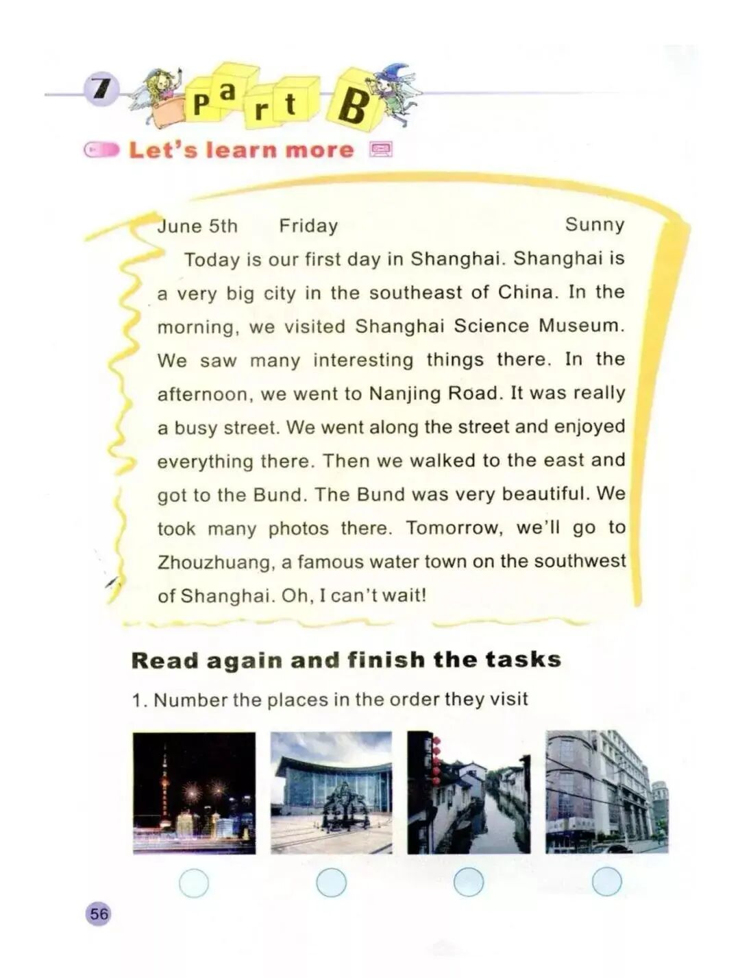 Today is our first day in Shanghai.Shanghai is a very big city in the southeast of China.In the morning, we visited many interesting things there.It was really a busy street.and enjoyed everything there.Then we walked to the east The Bund was very beautiful.We took many photos there.on the southwest of Shanghai.Read again and finish the tasksin the order they visit.