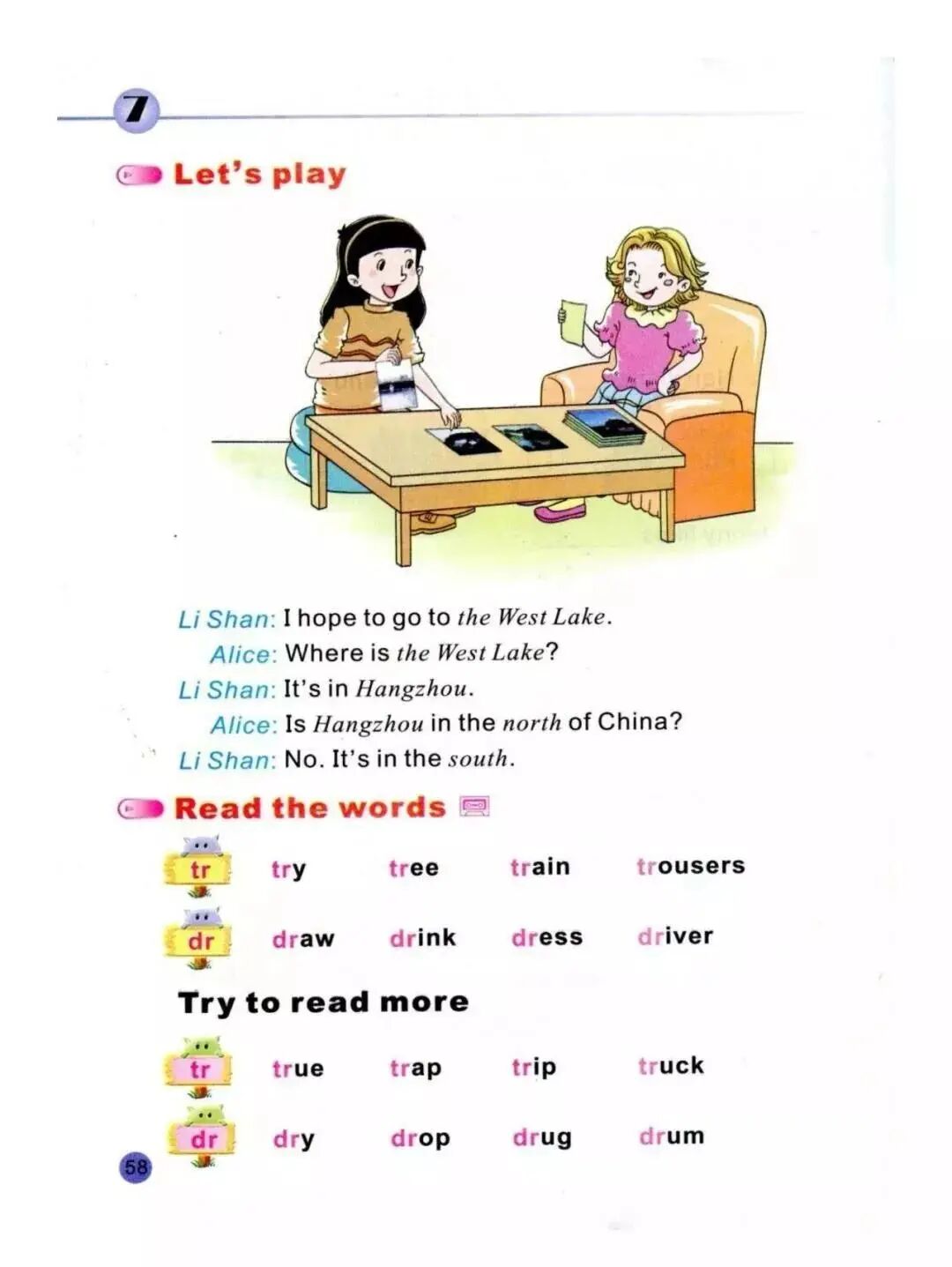 获取配套课件教案习题试卷请拉到文末课文朗读♬点击上方绿标听课文朗读微课讲解微课教学电子课本点击预习:新陕旅版英语六年级下册电子课本课文翻译June 5th Friday Sunny6月5日星期五阳光明媚 Today is our first day in Shanghai.今天是我们在上海的第一天。Shanghai is a very big city in the southeast of China.上海是中国东南部的一个大城市。In the morning, we visited Shanghai Science Museum.上午,我们参观了上海科学馆。We saw many interesting things there.我们在那里看到许多有趣的东西。In the afternoon, we went to Nanjing Road.下午,我们去了南京路。It was really a busy street.那真是一条繁忙的街道。We went along the street and enjoyed everything there.我们沿街走,享受那里的一切。Then we walked to the east and got to the Bund.然后我们向东走到外滩。The Bund was very beautiful.外滩很漂亮。We took many photos there.我们在那里拍了很多照片。Tomorrow, we’ll go to Zhouzhuang,明天,我们要去周庄,a famous water townon the southwest of Shanghai.上海西南的一个著名的水乡。Oh! I can’t wait!哦!我等不及了! Read again and finish the tasks再读一遍,完成任务 1.Number the places in the order they visit.按他们参观的顺序给这些地方编号。 2. Talk about Kitty’s holiday聊一聊基蒂的假期 Where did Kitty’s go on holiday?基蒂去哪儿度假了?She went ...她去了...... What did she do on the first day?她第一天做了什么?In the morning, she ...早上,她......In the afternoon, she ...下午,她......Then she ...然后她...... What place will Kitty visit tomorrow?基蒂明天要去什么地方?She’ll ...她要......。It is a ... on the ...一个......在......。Ask and answer问与答 Where did you go last summer?去年夏天你去哪儿了?I went to Lhasa.我去了拉萨。Where is Lhasa?拉萨在哪里?It’s in the west of China.它在中国的西部。What do you think of the people there?你觉得那里的人怎么样?They are very friendly.他们非常友好。Let’s play玩一玩 I hope to go to the West Lake.我希望去西湖。Where is the West Lake?西湖在哪里?It’s in Hangzhou.在杭州。Is Hangzhou in the north of China?杭州在中国的北部吗?No. It is in the south.不,在南方。 Read the words读单词 tr / tr /trytreetraintrousers尝试树木火车裤子 dr / dr /drawdrinkdressdriver画喝连衣裙司机 Try to read more多读多练trtruetraptriptruck真实的陷阱旅行卡车 drdrydropdrugdrum干的滴药物鼓同步习题一、单项选择。( ) 1. There are many places of _________in Shanghai. A. interesting B. interested C. interest( ) 2. _________ on. I’m not afraid of you. A. Come B. Came C. Do( ) 3. — Where did you go last year? — I_________ to China. A. go B. will go C. went( ) 4. We can enjoy the beautiful places _________ the way. A. with B. by C. along( ) 5. What are we _________ to talk about? A. going B. go C. went二、连词成句。1. interest,are,places,many,There,of (.) ____________________________________________2. be,on,Don’t,shy,Come(.) ____________________________________________3. walked,the,Mary,along,alone,street(.) ____________________________________________三、补全对话。A: What are we going to talk about ? B:1. ______________________ A: How about Hainan? B:2. ______________________ A: How about Shanghai? .B:3. ______________________ A: OK. Thank you.参考答案:一、1. C 2. A 3. C 4. C 5. A二、1.There are many places of interest.2. Come on. Don’tbe shy.3.Mary walked along the street alone.三、1. B 2. A 3. C怎么获取配套课件教案习题试卷等资料?▼下载方法(务必细看):关注微信公众订阅号【绿色学习平台】(ID:qqyu_520910),在公众号底部菜单中输入下面提示关键字,正常一分钟内即可下载。特别注明:1、如提取不了说明关键字输入错误或操作不当,可以留言等待处理。2、我们不做强制分享获取,但希望你获取资料后还能常来,能帮我们转发分享。3、来了就是朋友,多提意见和建议。 领取方法1 ▼第1步:扫码关注 绿色学习平台第2步:发送关键字【061】即可获取。如有疑问,请添加卿老师微信:yzy5200426。(请按照正确的关键字回复哦,不添字,不错字,不漏字,否则系统无法识别) 领取方法2 ▼打不开百度网盘链接的地区可长按扫码直接进入下载电脑端下载网址http://jazpan.com/view/22806.html▼(回复关键词位置如下图所示)图文来自网络,版权归原作者,如有不妥,告知即删点击阅读原文下载全册PPT课件动画教案习题朗读试卷电子课本整套资料