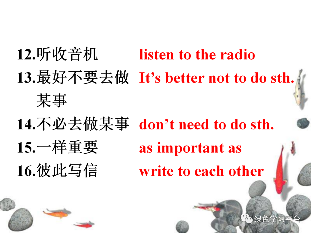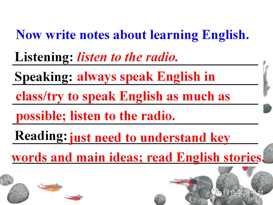 1、能够听懂讨论学习英语的方法和建议的对话。