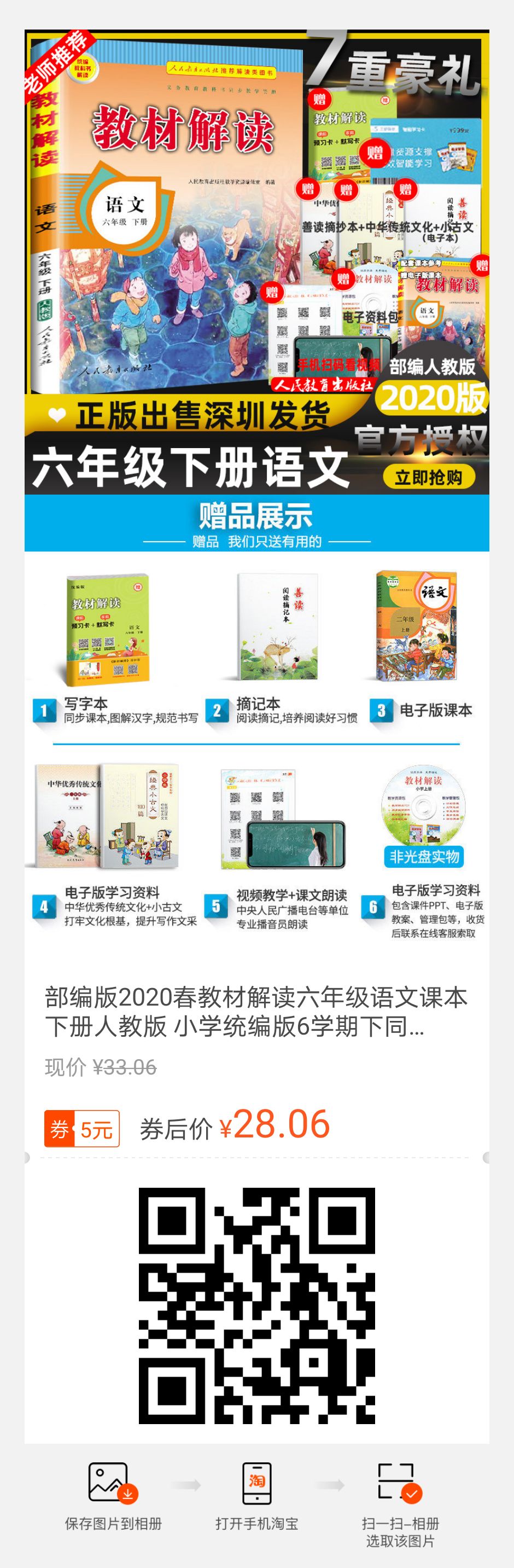 扫码查看下载全部资源部编版小学语文6年级电子课本部编六年级语文下册生字练字帖部编版2020春教材解读六年级语文课本下册人教版 小学统编版6学期下同步练习册妙解教材资料书人民教育出版社小学教材全解辅导训练 【包邮】【在售价】33.06元【券后价】28.06元【下单链接】https://m.tb.cn/h.VbhN5yj----------------- 注意,请完整复制这条信息,$fQQ21XrVByJ$,到【手机淘宝】即可查看最新2020版小学1-6年级寒假作业本汇编图文来自网络,版权归原作者,如有不妥,告知即删点击阅读原文下载全册PPT课件动画教案习题整套资料
