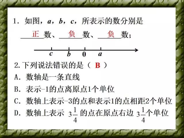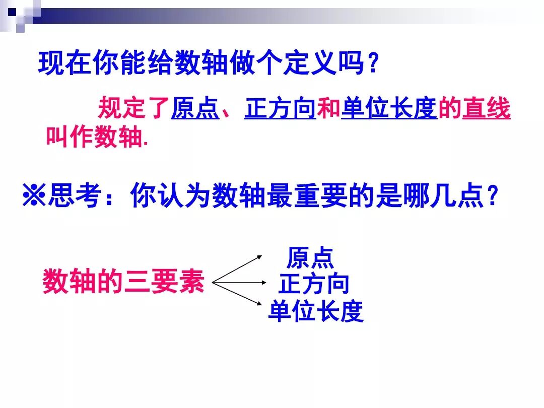 ⑴原点.正方向.单位长度称为数轴的三要素,三者缺一不可.