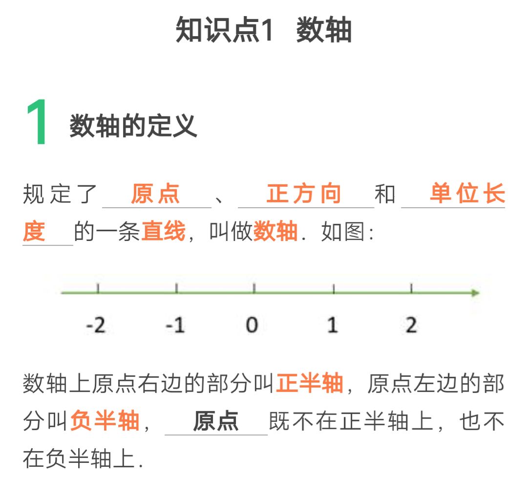 数轴:规定了原点、正方向和单位长度的直线叫做数轴(画数轴时,要注意上述规定的三要素缺一不可)。