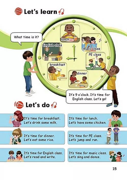 It’s time for music class.Let’s sing and dance.是音乐课的时间.让我们唱歌跳舞。