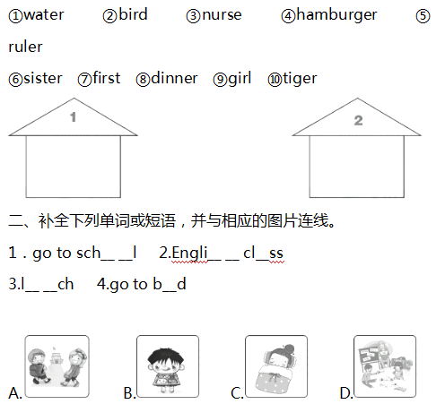 一、读单词,将画线部分读音相同的单词写在同一个房子里。