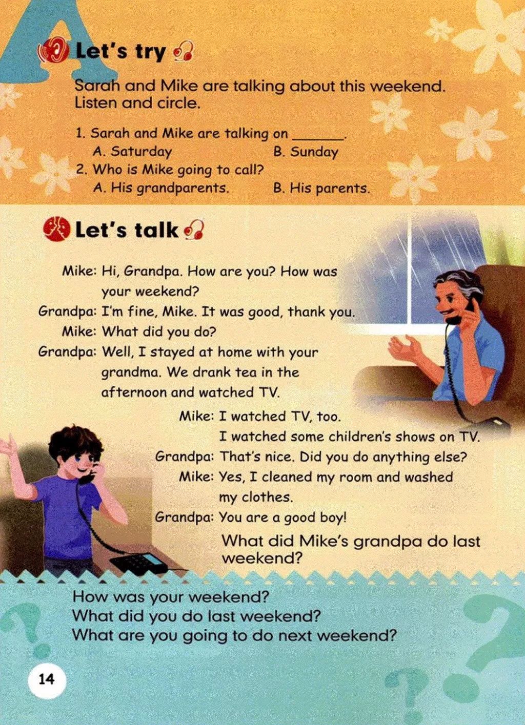 Mike:Hi,Grandpa. How are you? How was your weekend? 迈克:嗨,爷爷。你好吗?你周末过得怎么样?