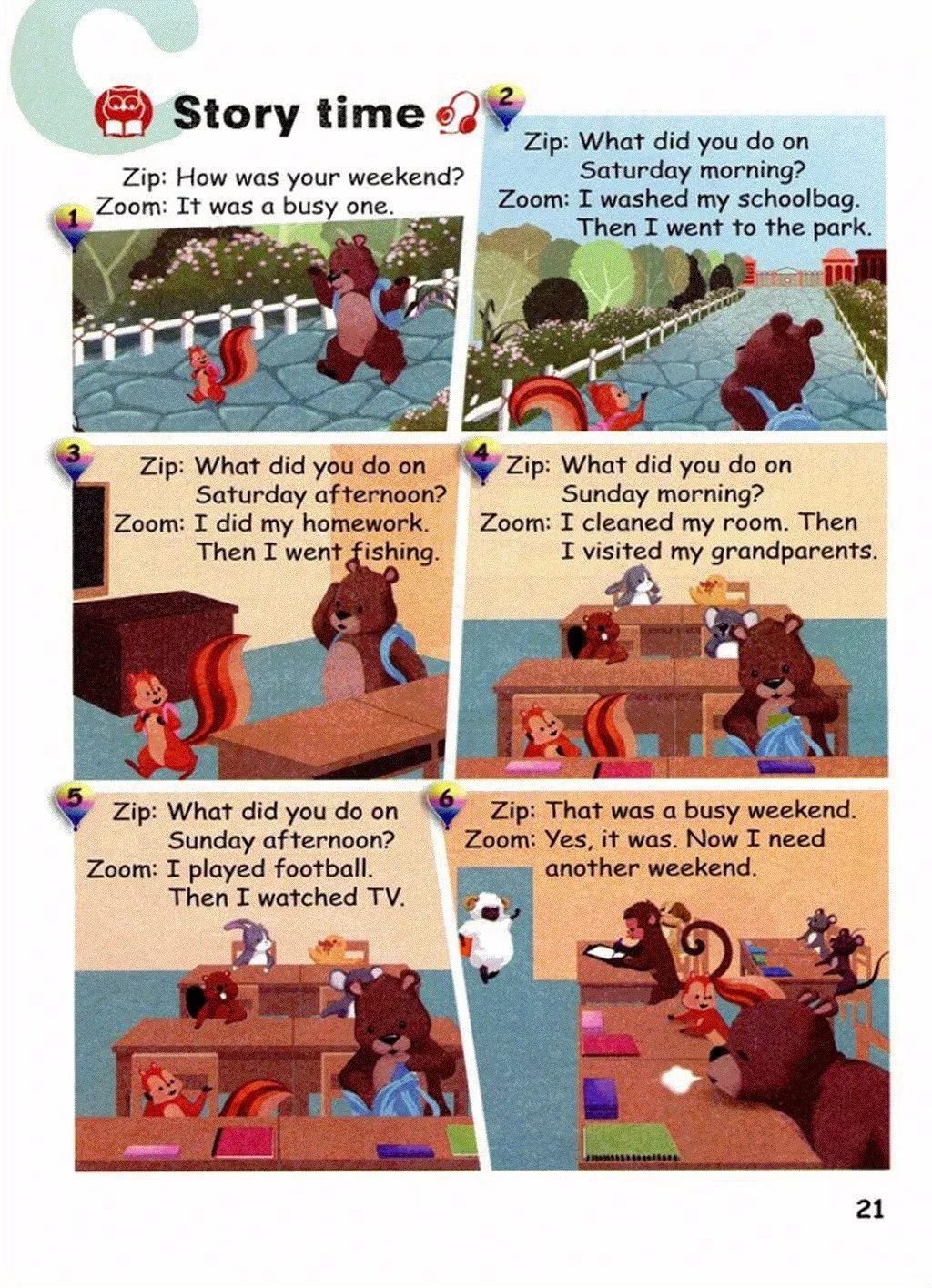 My name is Peter.I\\\\\'m a student.I had a busy weekend.I did my homework at home on Saturday morning.I went to the park by bike on Saturday afternoon.I cleaned my room on Sunday morning.On Sunday afternoon I visited my grandparents.At night,I watched TV with my parents.I was very tired,but I was very happy.