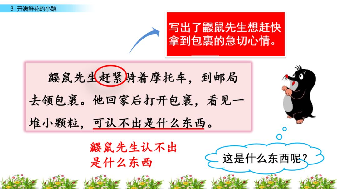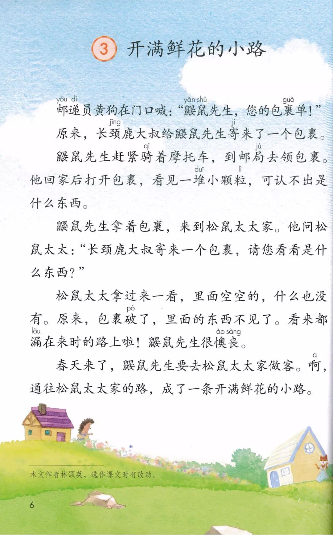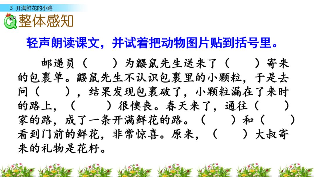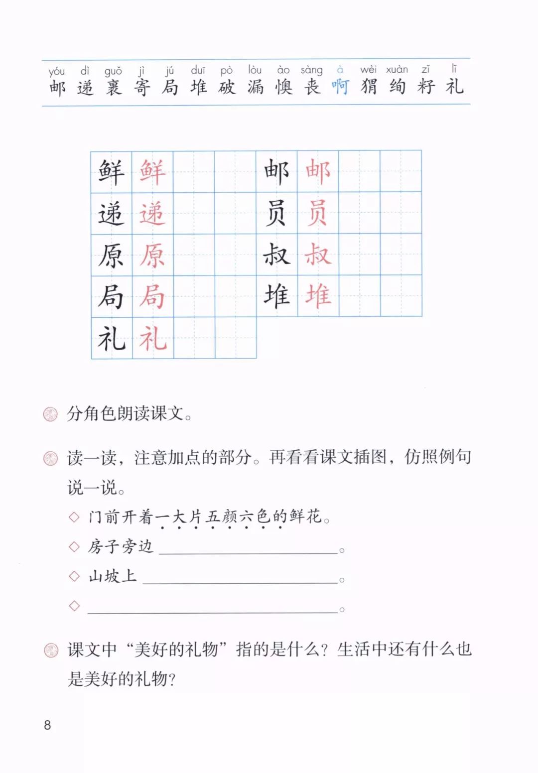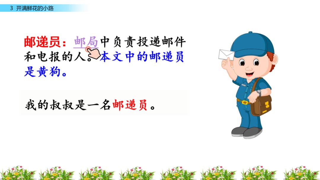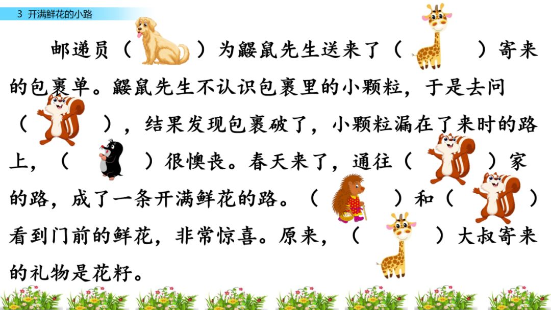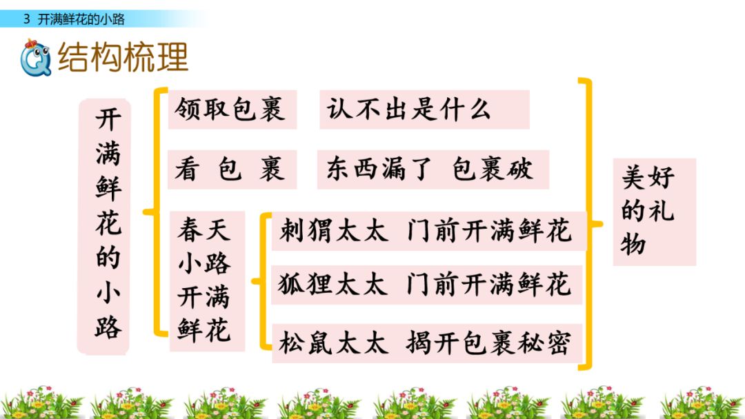 扫码查看下载全部资源二年级语文课程知识精讲汇总二年级数学课程知识精讲汇总部编二年级语文下全册朗读+知识点1《古诗二首》图文精讲2《找春天》图文精讲3 开满鲜花的小路 视频电子教材点击图片,查看大图▼▼▼▼音视频朗读微课精讲知识点读一读,记一记鲜花 邮递员 先生 原来 大树 邮局 东西 太太 做客 惊奇 快活 去年 美好 礼物我会写:鲜(鲜花)(新鲜)(鲜红)(鲜艳)邮(邮递员)(邮票)(邮局)(邮件)递(传递)(快递)(邮递)(递给)员(队员)(员工)(演员)(学员)原(原来)(草原)(高原)(原因)叔(大叔)(叔叔)(叔公)(叔母)局(邮局)(局长)(局面)(出局)堆(土堆)(沙堆)(堆放)(扎堆)礼(礼物)(礼品)(队礼)(军礼)易错字:字音包裹(guǒ) 一堆(duī) 懊丧( sàng) 花籽(zǐ)字形“局”的第四笔是“”。“堆”的最右边是四横。多音字:种zhǒng(种子) zhòng(种树)奶奶把牡丹花的种(zhǒng)子种(zhòng)到了花盆里。近义词:懊丧—懊悔 美好—美妙 快活—快乐正巧—恰巧 惊奇—惊讶 赶紧—赶快 绚丽多彩—五颜六色反义词:懊丧—振奋 快活—伤心 绚丽多彩—暗淡无光 词语搭配:一个包裹 一堆颗粒 一条小路 一片鲜花寄包裹 领包裹 骑摩托车 绚丽多彩的鲜花 美好的礼物 惊奇地说 奇怪地问 快活地蹦跳佳句:1、 啊,通往松鼠太太家的路,成了一条开满鲜花的小路。2、 松鼠太太走出门,看见门前的小路上花朵簇簇,小松鼠、小刺猬和小狐狸在那里快活地蹦啊跳啊。教材分析:《开满鲜花的小路》以童话故事的方式讲述了邮递员黄狗给鼹鼠先生寄送包裹,结果包裹破了,鼹鼠先生不知道是什么。春天到了,沿路开满了鲜花,大家觉得真美,赞扬这是“多么美好的礼物”。《开满鲜花的小路》是一个温馨浪漫充满儿童情趣的童话故事,它运用拟人的修辞手法,讲述了长颈鹿大叔给鼹鼠先生寄来邮包,鼹鼠先生不知道里面一粒粒的籽是什么?就去问松鼠太太,到了松鼠太太的家,发现邮包里面是空的,松鼠太太发现了邮包上有个小洞,春天的时候通往松鼠太太的家有条开满鲜花的小路的故事。该故事虽然篇幅不长,人物对话简单洁明了,但为孩子营造了一个浪漫温馨的氛围,小路上,花朵簇簇,花香飘动,多美呀!这花是谁种的呢?富有悬念有趣的故事情节能吸引孩子的注意,生动浅显的语言,又便于孩子理解、记忆、学习。课文主题:本文写了长颈鹿大叔寄给鼹鼠先生的花籽,被鼹鼠先生无意中漏在路上,第二年春天,出现了一条开满鲜花的小路,给大家带来了花香和快乐的故事。表现了小动物之间和谐相处的美好景象。课后习题答案:2、读一读,注意加点的部分。再看看课文插图,仿照例句说一说。例1:◇门前开着一大片五颜六色的鲜花。◇房子旁边_有一条弯弯的小路。◇山坡上有一片郁郁葱葱的树林。◇村子外面有一条明亮的小河_。例2:◇门前开着一大片五颜六色的鲜花。◇房子旁边_长着一大丛绿油油的灌木。◇山坡长着一大片嫩绿的小草。◇小路上走着一群快乐的动物_。3、课文中美好的礼物指的是什么?为什么称为美好的礼物?联系生活,说一说还有哪些是“美好的礼物”?答:文中“美好的礼物”指长颈鹿寄给鼹鼠先生的花籽。因为花籽也是快乐的种子,长颈鹿把快乐传递给鼹鼠,鼹鼠无意间把快乐传递给了大家,所以说是美好的礼物。能够给他人带去快乐,能够温暖人心的礼物就是美好的礼物,如:为环卫工人送水,参加植树养树活动,贫困山区的孩子在寒冬收到热心人捐送的棉衣,为劳累的妈妈端来一盆热热的洗脚水……图文解读点击图片,查看大图▼▼▼▼同步练习1一、根据拼音写词语。 yuán lái dà shū yóu dì yuán ( )( ) ( )二、给下面的字加上一部分,变成一个新字,并组一个词语。弟-( )-( ) 由-( )-( )三、填一填(不重复)。一 ( )包裹 一( )小颗粒 一( )鲜花一( ) 小路 一( )礼物 一( )鲜花四、课文综合阅读。鼹鼠先生来到松鼠太太门前。松鼠太太走出门,看见门前的小路上花朵簇簇,小松鼠、小刺猬和小狐狸在那里快活地蹦啊跳啊。松鼠太太对鼹鼠先生说:“我知道了,去年长颈鹿大叔寄给你的是花籽。这是多么美好的礼物啊!” 1.上面的文字有( )个自然段,写了( )、( ) 、( )、( )、( )等几个人物。 2. “这是多么美好的礼物啊”,“这”指的是( ) 为什么松鼠太太要这么说? 五、做一做礼物。读了本文后,你打算给你身边的人送礼物吗?如果想,你将会送什么?请把你的想法写在下面: 。答案一、原 来 大叔 自行车 邮递员二、递 传递 邮 邮局三、一 ( 个 )包裹 一( 堆 )小颗粒 一( 片 )鲜花一( 条 ) 小路 一( 件 )礼物 一( 朵 )鲜花四、1.2 鼹鼠先生、松鼠太太、松鼠、小刺猬和小狐狸2.花籽 洒落的花籽给大家带来的美好感受五、提示:所送的礼物能够给大家带来好处。同步练习2往期精彩回顾●部编二年级语文下册●【知识点及朗读精讲】部编二年级语文下全册朗读+知识点部编小学语文二年级下册电子课本部编二年级语文下册教材全解读【字词句】部编二年级语文下册生字练字帖部编二年级语文下册词语表部编二年级语文下全册多音字汇总部编二年级语文下全册看拼音写词语部编二年级语文下册写字表(田字格)【看图写话习作】二年级看图写话经典实训15则二年级看图写话满分教程(附视频)【课文理解】部编二年级语文下全册课文原文部编二年级语文下全册课文板书设计部编二年级语文下全册按课文内容填空(第1-9