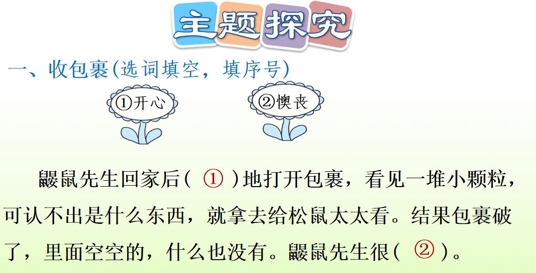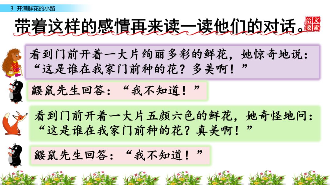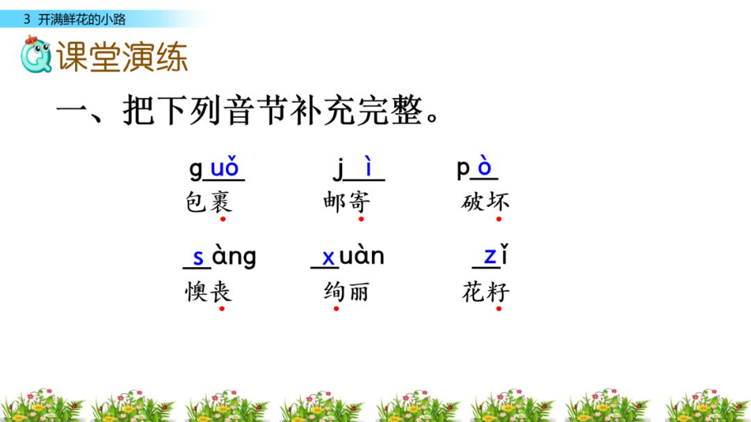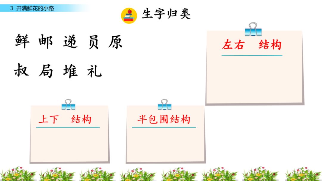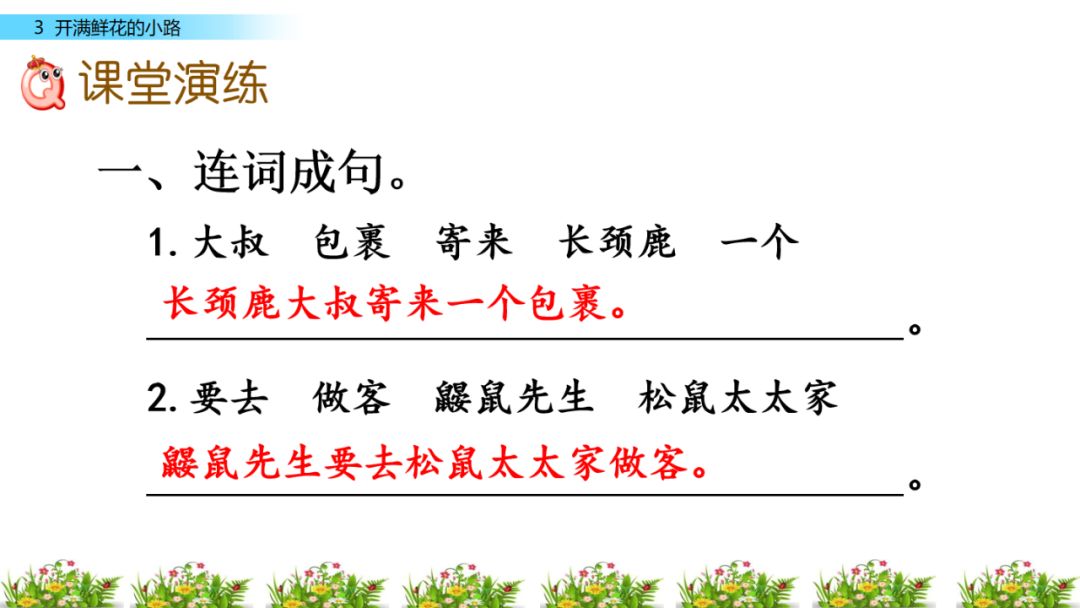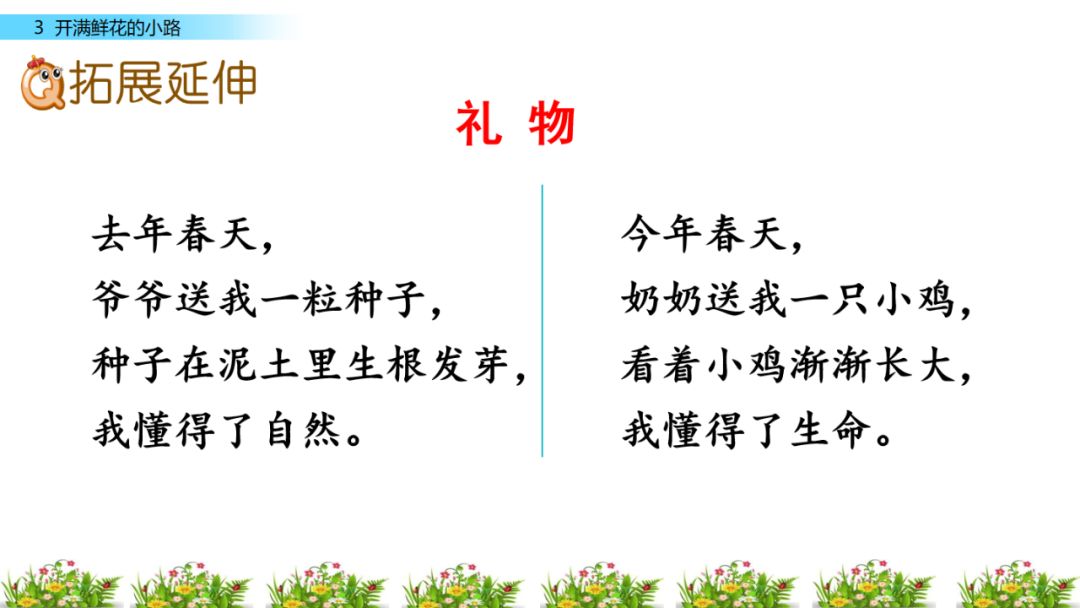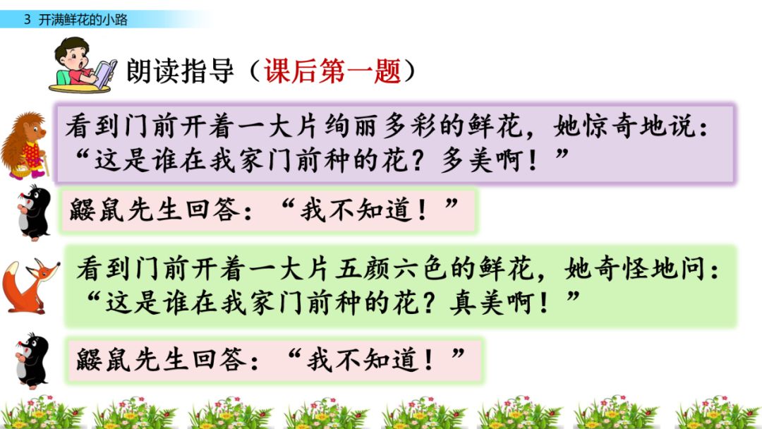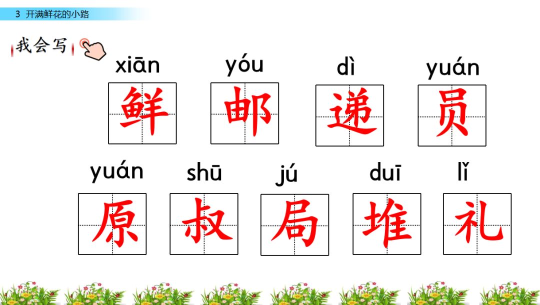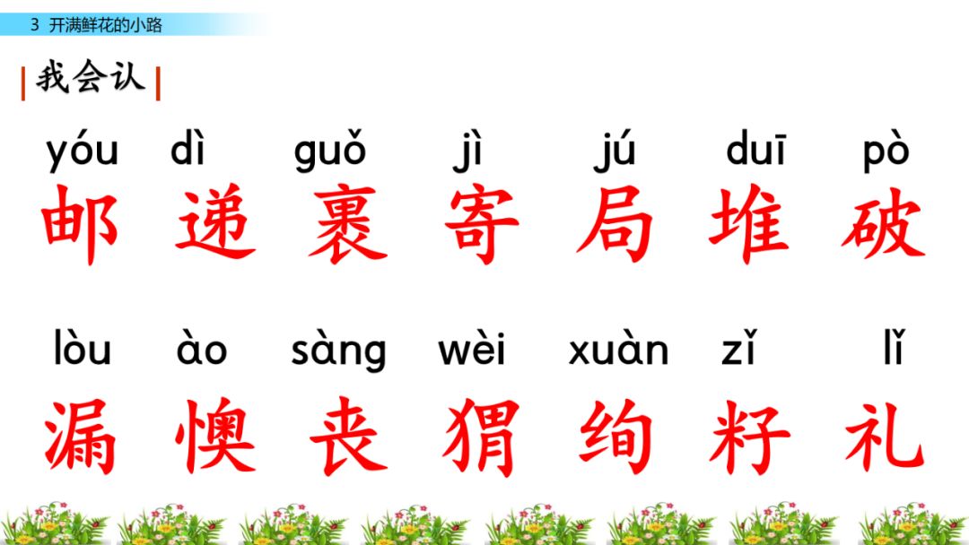 扫码查看下载全部资源二年级语文课程知识精讲汇总二年级数学课程知识精讲汇总部编二年级语文下全册朗读+知识点1《古诗二首》图文精讲2《找春天》图文精讲3 开满鲜花的小路 视频电子教材点击图片,查看大图▼▼▼▼音视频朗读微课精讲知识点读一读,记一记鲜花 邮递员 先生 原来 大树 邮局 东西 太太 做客 惊奇 快活 去年 美好 礼物我会写:鲜(鲜花)(新鲜)(鲜红)(鲜艳)邮(邮递员)(邮票)(邮局)(邮件)递(传递)(快递)(邮递)(递给)员(队员)(员工)(演员)(学员)原(原来)(草原)(高原)(原因)叔(大叔)(叔叔)(叔公)(叔母)局(邮局)(局长)(局面)(出局)堆(土堆)(沙堆)(堆放)(扎堆)礼(礼物)(礼品)(队礼)(军礼)易错字:字音包裹(guǒ) 一堆(duī) 懊丧( sàng) 花籽(zǐ)字形“局”的第四笔是“”。“堆”的最右边是四横。多音字:种zhǒng(种子) zhòng(种树)奶奶把牡丹花的种(zhǒng)子种(zhòng)到了花盆里。近义词:懊丧—懊悔 美好—美妙 快活—快乐正巧—恰巧 惊奇—惊讶 赶紧—赶快 绚丽多彩—五颜六色反义词:懊丧—振奋 快活—伤心 绚丽多彩—暗淡无光 词语搭配:一个包裹 一堆颗粒 一条小路 一片鲜花寄包裹 领包裹 骑摩托车 绚丽多彩的鲜花 美好的礼物 惊奇地说 奇怪地问 快活地蹦跳佳句:1、 啊,通往松鼠太太家的路,成了一条开满鲜花的小路。2、 松鼠太太走出门,看见门前的小路上花朵簇簇,小松鼠、小刺猬和小狐狸在那里快活地蹦啊跳啊。教材分析:《开满鲜花的小路》以童话故事的方式讲述了邮递员黄狗给鼹鼠先生寄送包裹,结果包裹破了,鼹鼠先生不知道是什么。春天到了,沿路开满了鲜花,大家觉得真美,赞扬这是“多么美好的礼物”。《开满鲜花的小路》是一个温馨浪漫充满儿童情趣的童话故事,它运用拟人的修辞手法,讲述了长颈鹿大叔给鼹鼠先生寄来邮包,鼹鼠先生不知道里面一粒粒的籽是什么?就去问松鼠太太,到了松鼠太太的家,发现邮包里面是空的,松鼠太太发现了邮包上有个小洞,春天的时候通往松鼠太太的家有条开满鲜花的小路的故事。该故事虽然篇幅不长,人物对话简单洁明了,但为孩子营造了一个浪漫温馨的氛围,小路上,花朵簇簇,花香飘动,多美呀!这花是谁种的呢?富有悬念有趣的故事情节能吸引孩子的注意,生动浅显的语言,又便于孩子理解、记忆、学习。课文主题:本文写了长颈鹿大叔寄给鼹鼠先生的花籽,被鼹鼠先生无意中漏在路上,第二年春天,出现了一条开满鲜花的小路,给大家带来了花香和快乐的故事。表现了小动物之间和谐相处的美好景象。课后习题答案:2、读一读,注意加点的部分。再看看课文插图,仿照例句说一说。例1:◇门前开着一大片五颜六色的鲜花。◇房子旁边_有一条弯弯的小路。◇山坡上有一片郁郁葱葱的树林。◇村子外面有一条明亮的小河_。例2:◇门前开着一大片五颜六色的鲜花。◇房子旁边_长着一大丛绿油油的灌木。◇山坡长着一大片嫩绿的小草。◇小路上走着一群快乐的动物_。3、课文中美好的礼物指的是什么?为什么称为美好的礼物?联系生活,说一说还有哪些是“美好的礼物”?答:文中“美好的礼物”指长颈鹿寄给鼹鼠先生的花籽。因为花籽也是快乐的种子,长颈鹿把快乐传递给鼹鼠,鼹鼠无意间把快乐传递给了大家,所以说是美好的礼物。能够给他人带去快乐,能够温暖人心的礼物就是美好的礼物,如:为环卫工人送水,参加植树养树活动,贫困山区的孩子在寒冬收到热心人捐送的棉衣,为劳累的妈妈端来一盆热热的洗脚水……图文解读点击图片,查看大图▼▼▼▼同步练习1一、根据拼音写词语。 yuán lái dà shū yóu dì yuán ( )( ) ( )二、给下面的字加上一部分,变成一个新字,并组一个词语。弟-( )-( ) 由-( )-( )三、填一填(不重复)。一 ( )包裹 一( )小颗粒 一( )鲜花一( ) 小路 一( )礼物 一( )鲜花四、课文综合阅读。鼹鼠先生来到松鼠太太门前。松鼠太太走出门,看见门前的小路上花朵簇簇,小松鼠、小刺猬和小狐狸在那里快活地蹦啊跳啊。松鼠太太对鼹鼠先生说:“我知道了,去年长颈鹿大叔寄给你的是花籽。这是多么美好的礼物啊!” 1.上面的文字有( )个自然段,写了( )、( ) 、( )、( )、( )等几个人物。 2. “这是多么美好的礼物啊”,“这”指的是( ) 为什么松鼠太太要这么说? 五、做一做礼物。读了本文后,你打算给你身边的人送礼物吗?如果想,你将会送什么?请把你的想法写在下面: 。答案一、原 来 大叔 自行车 邮递员二、递 传递 邮 邮局三、一 ( 个 )包裹 一( 堆 )小颗粒 一( 片 )鲜花一( 条 ) 小路 一( 件 )礼物 一( 朵 )鲜花四、1.2 鼹鼠先生、松鼠太太、松鼠、小刺猬和小狐狸2.花籽 洒落的花籽给大家带来的美好感受五、提示:所送的礼物能够给大家带来好处。同步练习2往期精彩回顾●部编二年级语文下册●【知识点及朗读精讲】部编二年级语文下全册朗读+知识点部编小学语文二年级下册电子课本部编二年级语文下册教材全解读【字词句】部编二年级语文下册生字练字帖部编二年级语文下册词语表部编二年级语文下全册多音字汇总部编二年级语文下全册看拼音写词语部编二年级语文下册写字表(田字格)【看图写话习作】二年级看图写话经典实训15则二年级看图写话满分教程(附视频)【课文理解】部编二年级语文下全册课文原文部编二年级语文下全册课文板书设计部编二年级语文下全册按课文内容填空(第1-9