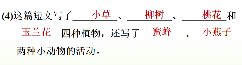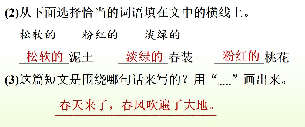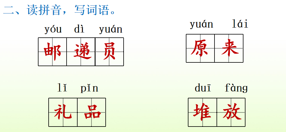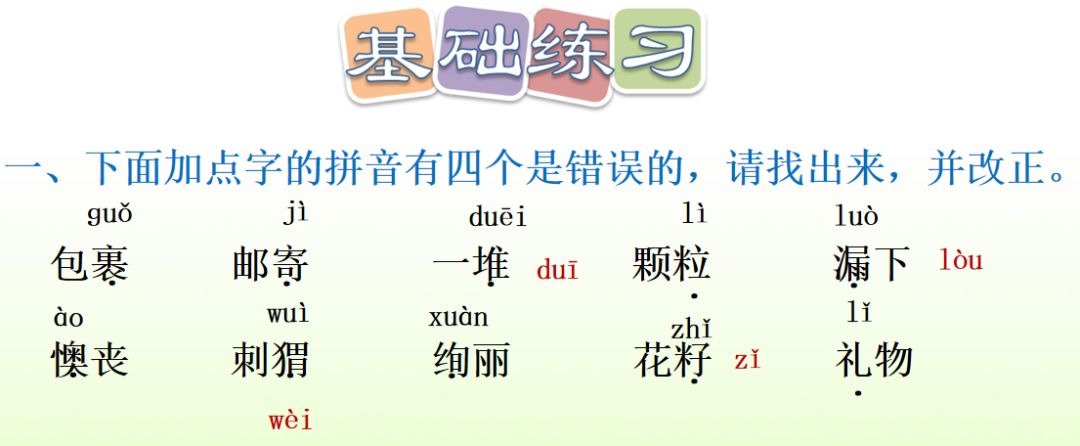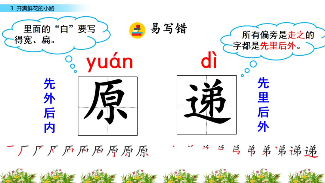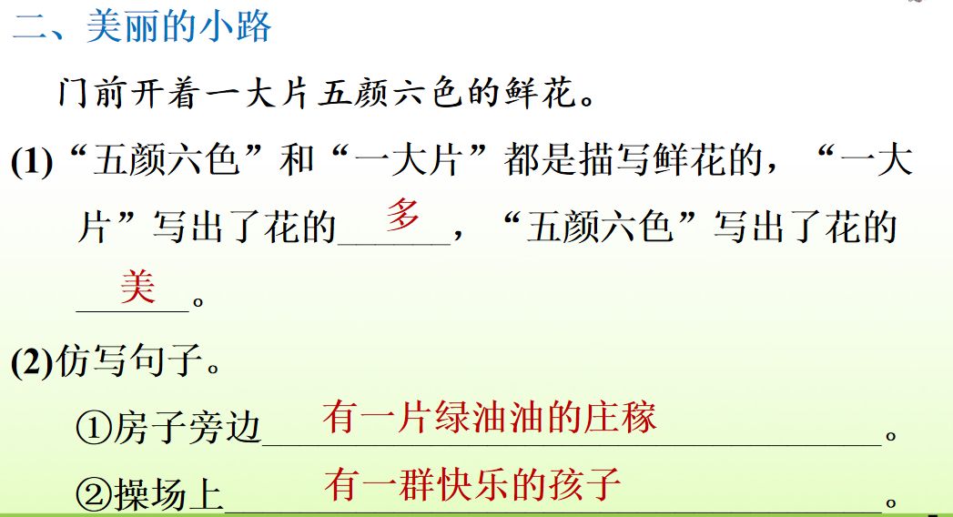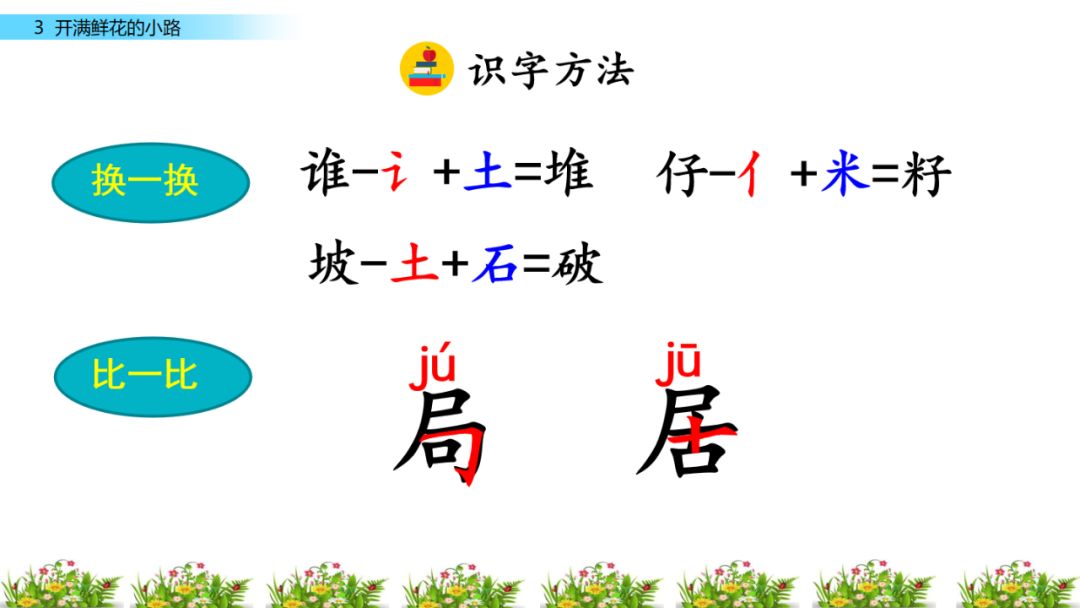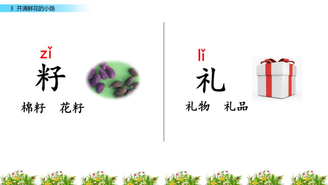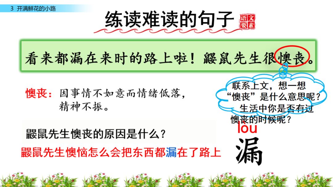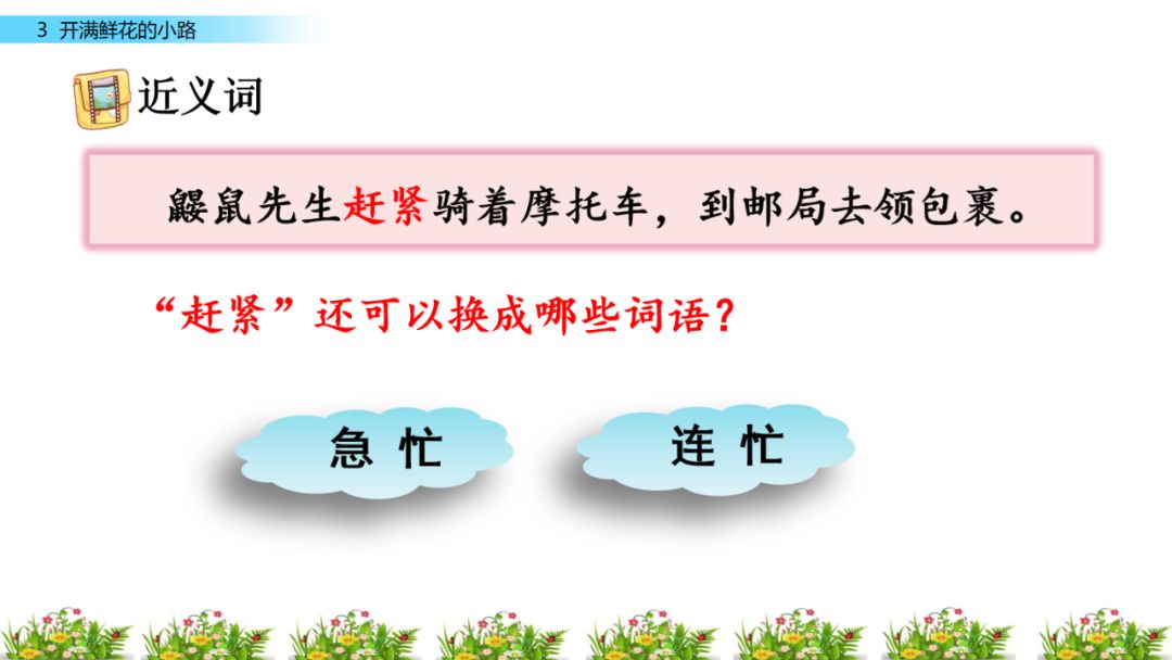 扫码查看下载全部资源二年级语文课程知识精讲汇总二年级数学课程知识精讲汇总部编二年级语文下全册朗读+知识点1《古诗二首》图文精讲2《找春天》图文精讲3 开满鲜花的小路 视频电子教材点击图片,查看大图▼▼▼▼音视频朗读微课精讲知识点读一读,记一记鲜花 邮递员 先生 原来 大树 邮局 东西 太太 做客 惊奇 快活 去年 美好 礼物我会写:鲜(鲜花)(新鲜)(鲜红)(鲜艳)邮(邮递员)(邮票)(邮局)(邮件)递(传递)(快递)(邮递)(递给)员(队员)(员工)(演员)(学员)原(原来)(草原)(高原)(原因)叔(大叔)(叔叔)(叔公)(叔母)局(邮局)(局长)(局面)(出局)堆(土堆)(沙堆)(堆放)(扎堆)礼(礼物)(礼品)(队礼)(军礼)易错字:字音包裹(guǒ) 一堆(duī) 懊丧( sàng) 花籽(zǐ)字形“局”的第四笔是“”。“堆”的最右边是四横。多音字:种zhǒng(种子) zhòng(种树)奶奶把牡丹花的种(zhǒng)子种(zhòng)到了花盆里。近义词:懊丧—懊悔 美好—美妙 快活—快乐正巧—恰巧 惊奇—惊讶 赶紧—赶快 绚丽多彩—五颜六色反义词:懊丧—振奋 快活—伤心 绚丽多彩—暗淡无光 词语搭配:一个包裹 一堆颗粒 一条小路 一片鲜花寄包裹 领包裹 骑摩托车 绚丽多彩的鲜花 美好的礼物 惊奇地说 奇怪地问 快活地蹦跳佳句:1、 啊,通往松鼠太太家的路,成了一条开满鲜花的小路。2、 松鼠太太走出门,看见门前的小路上花朵簇簇,小松鼠、小刺猬和小狐狸在那里快活地蹦啊跳啊。教材分析:《开满鲜花的小路》以童话故事的方式讲述了邮递员黄狗给鼹鼠先生寄送包裹,结果包裹破了,鼹鼠先生不知道是什么。春天到了,沿路开满了鲜花,大家觉得真美,赞扬这是“多么美好的礼物”。《开满鲜花的小路》是一个温馨浪漫充满儿童情趣的童话故事,它运用拟人的修辞手法,讲述了长颈鹿大叔给鼹鼠先生寄来邮包,鼹鼠先生不知道里面一粒粒的籽是什么?就去问松鼠太太,到了松鼠太太的家,发现邮包里面是空的,松鼠太太发现了邮包上有个小洞,春天的时候通往松鼠太太的家有条开满鲜花的小路的故事。该故事虽然篇幅不长,人物对话简单洁明了,但为孩子营造了一个浪漫温馨的氛围,小路上,花朵簇簇,花香飘动,多美呀!这花是谁种的呢?富有悬念有趣的故事情节能吸引孩子的注意,生动浅显的语言,又便于孩子理解、记忆、学习。课文主题:本文写了长颈鹿大叔寄给鼹鼠先生的花籽,被鼹鼠先生无意中漏在路上,第二年春天,出现了一条开满鲜花的小路,给大家带来了花香和快乐的故事。表现了小动物之间和谐相处的美好景象。课后习题答案:2、读一读,注意加点的部分。再看看课文插图,仿照例句说一说。例1:◇门前开着一大片五颜六色的鲜花。◇房子旁边_有一条弯弯的小路。◇山坡上有一片郁郁葱葱的树林。◇村子外面有一条明亮的小河_。例2:◇门前开着一大片五颜六色的鲜花。◇房子旁边_长着一大丛绿油油的灌木。◇山坡长着一大片嫩绿的小草。◇小路上走着一群快乐的动物_。3、课文中美好的礼物指的是什么?为什么称为美好的礼物?联系生活,说一说还有哪些是“美好的礼物”?答:文中“美好的礼物”指长颈鹿寄给鼹鼠先生的花籽。因为花籽也是快乐的种子,长颈鹿把快乐传递给鼹鼠,鼹鼠无意间把快乐传递给了大家,所以说是美好的礼物。能够给他人带去快乐,能够温暖人心的礼物就是美好的礼物,如:为环卫工人送水,参加植树养树活动,贫困山区的孩子在寒冬收到热心人捐送的棉衣,为劳累的妈妈端来一盆热热的洗脚水……图文解读点击图片,查看大图▼▼▼▼同步练习1一、根据拼音写词语。 yuán lái dà shū yóu dì yuán ( )( ) ( )二、给下面的字加上一部分,变成一个新字,并组一个词语。弟-( )-( ) 由-( )-( )三、填一填(不重复)。一 ( )包裹 一( )小颗粒 一( )鲜花一( ) 小路 一( )礼物 一( )鲜花四、课文综合阅读。鼹鼠先生来到松鼠太太门前。松鼠太太走出门,看见门前的小路上花朵簇簇,小松鼠、小刺猬和小狐狸在那里快活地蹦啊跳啊。松鼠太太对鼹鼠先生说:“我知道了,去年长颈鹿大叔寄给你的是花籽。这是多么美好的礼物啊!” 1.上面的文字有( )个自然段,写了( )、( ) 、( )、( )、( )等几个人物。 2. “这是多么美好的礼物啊”,“这”指的是( ) 为什么松鼠太太要这么说? 五、做一做礼物。读了本文后,你打算给你身边的人送礼物吗?如果想,你将会送什么?请把你的想法写在下面: 。答案一、原 来 大叔 自行车 邮递员二、递 传递 邮 邮局三、一 ( 个 )包裹 一( 堆 )小颗粒 一( 片 )鲜花一( 条 ) 小路 一( 件 )礼物 一( 朵 )鲜花四、1.2 鼹鼠先生、松鼠太太、松鼠、小刺猬和小狐狸2.花籽 洒落的花籽给大家带来的美好感受五、提示:所送的礼物能够给大家带来好处。同步练习2往期精彩回顾●部编二年级语文下册●【知识点及朗读精讲】部编二年级语文下全册朗读+知识点部编小学语文二年级下册电子课本部编二年级语文下册教材全解读【字词句】部编二年级语文下册生字练字帖部编二年级语文下册词语表部编二年级语文下全册多音字汇总部编二年级语文下全册看拼音写词语部编二年级语文下册写字表(田字格)【看图写话习作】二年级看图写话经典实训15则二年级看图写话满分教程(附视频)【课文理解】部编二年级语文下全册课文原文部编二年级语文下全册课文板书设计部编二年级语文下全册按课文内容填空(第1-9