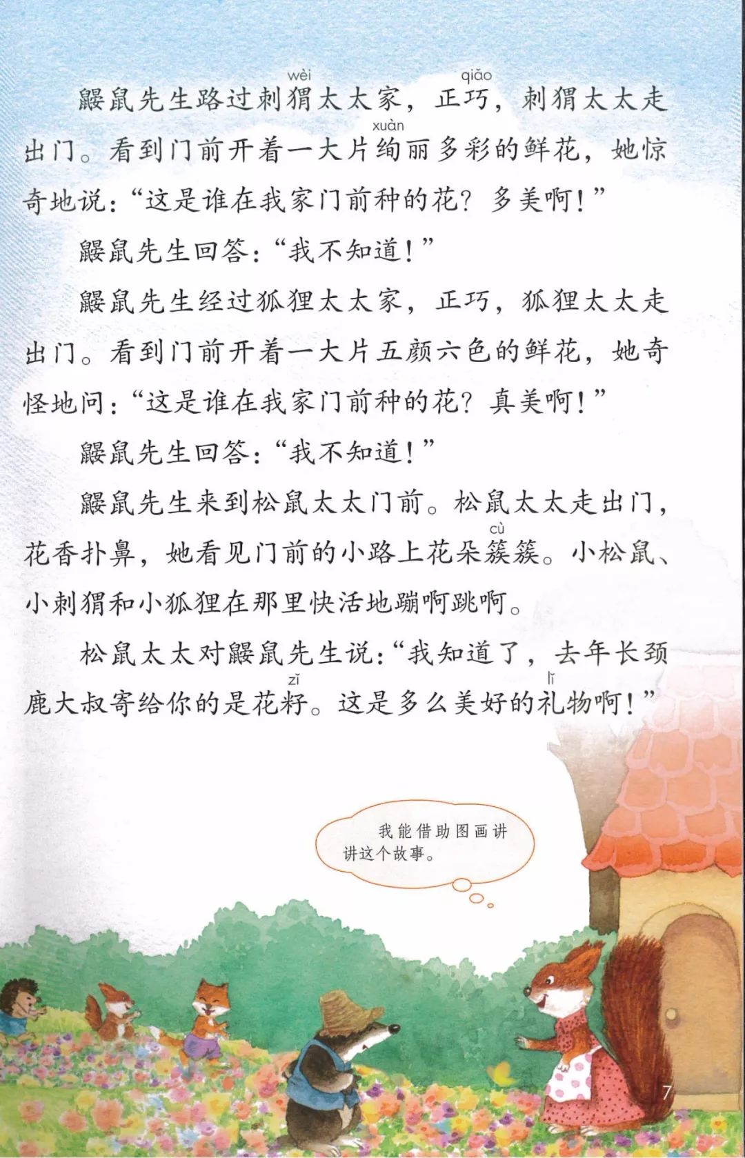 松鼠太太对鼹鼠先生说:“我知道了,去年长颈鹿大叔寄给你的是花籽。这是多么美好的礼物啊!”