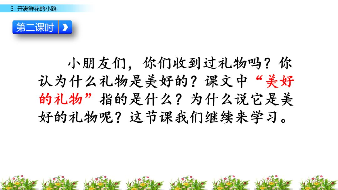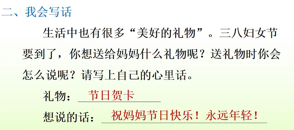 3、课文中美好的礼物指的是什么?为什么称为美好的礼物?联系生活,说一说还有哪些是“美好的礼物”?