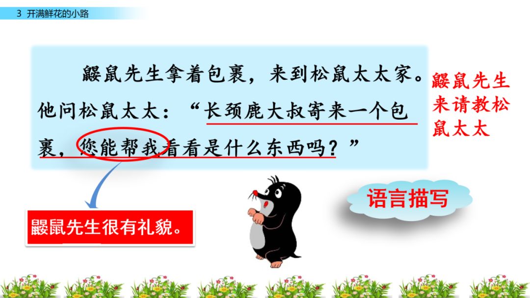 《开满鲜花的小路》以童话故事的方式讲述了邮递员黄狗给鼹鼠先生寄送包裹,结果包裹破了,鼹鼠先生不知道是什么。春天到了,沿路开满了鲜花,大家觉得真美,赞扬这是“多么美好的礼物”。《开满鲜花的小路》是一个温馨浪漫充满儿童情趣的童话故事,它运用拟人的修辞手法,讲述了长颈鹿大叔给鼹鼠先生寄来邮包,鼹鼠先生不知道里面一粒粒的籽是什么?就去问松鼠太太,到了松鼠太太的家,发现邮包里面是空的,松鼠太太发现了邮包上有个小洞,春天的时候通往松鼠太太的家有条开满鲜花的小路的故事。该故事虽然篇幅不长,人物对话简单洁明了,但为孩子营造了一个浪漫温馨的氛围,小路上,花朵簇簇,花香飘动,多美呀!这花是谁种的呢?富有悬念有趣的故事情节能吸引孩子的注意,生动浅显的语言,又便于孩子理解、记忆、学习。
