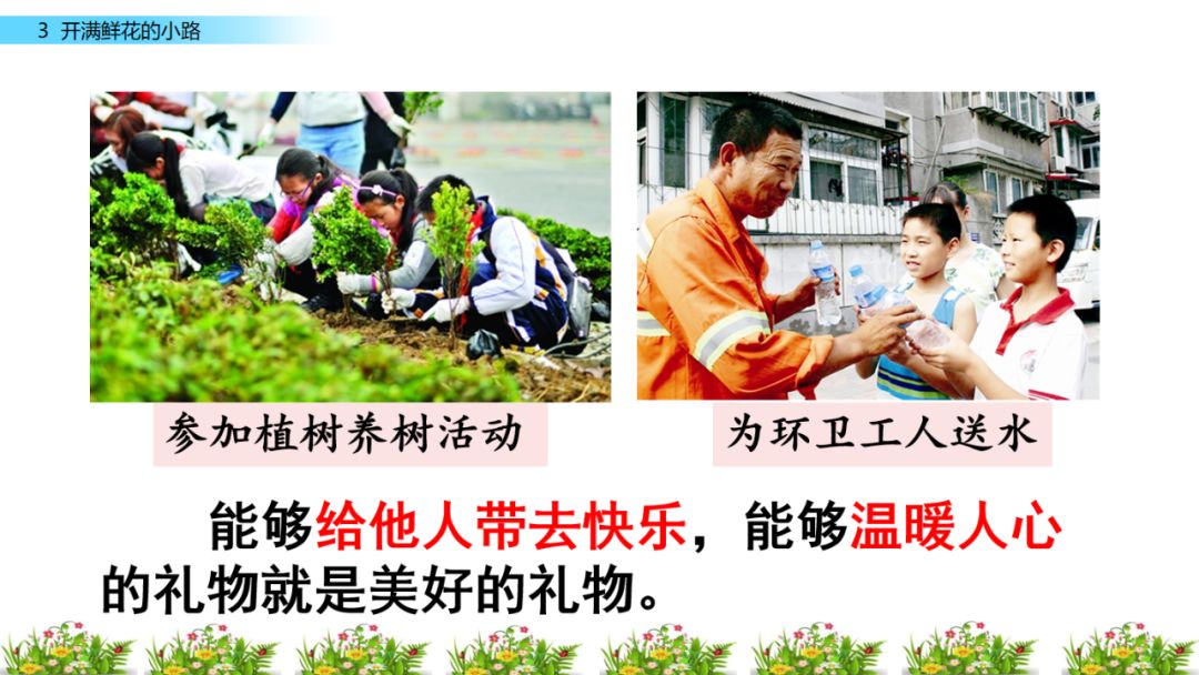 答:文中“美好的礼物”指长颈鹿寄给鼹鼠先生的花籽。因为花籽也是快乐的种子,长颈鹿把快乐传递给鼹鼠,鼹鼠无意间把快乐传递给了大家,所以说是美好的礼物。能够给他人带去快乐,能够温暖人心的礼物就是美好的礼物,如:为环卫工人送水,参加植树养树活动,贫困山区的孩子在寒冬收到热心人捐送的棉衣,为劳累的妈妈端来一盆热热的洗脚水……