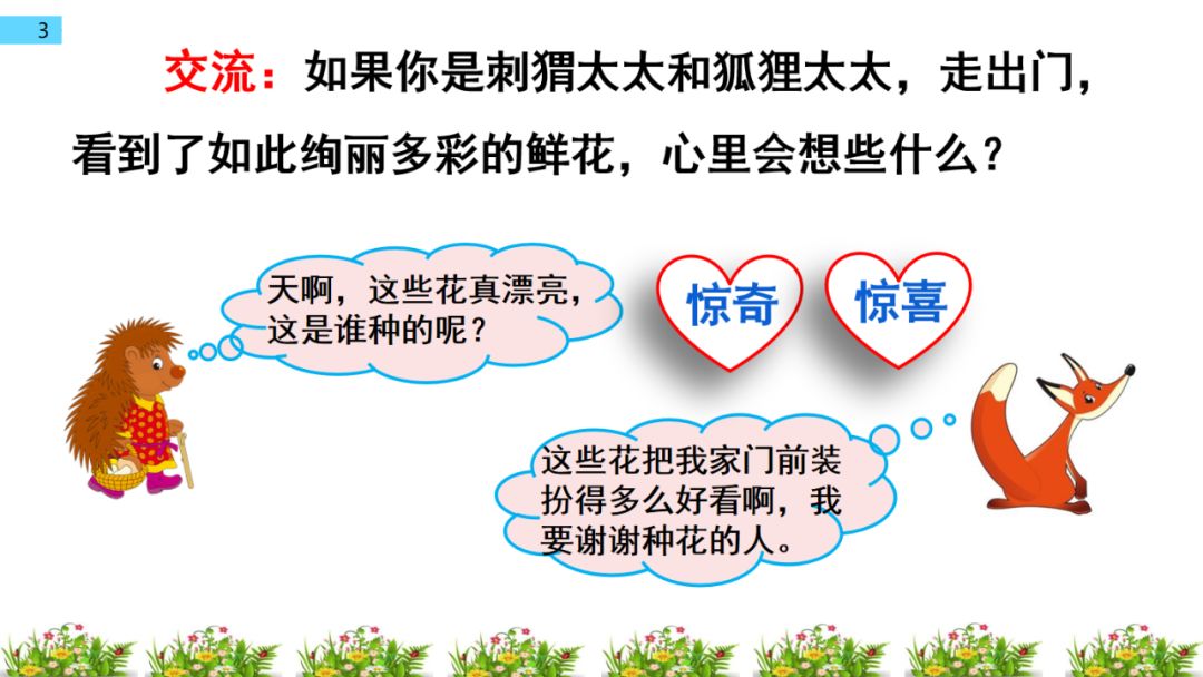 2、 松鼠太太走出门,看见门前的小路上花朵簇簇,小松鼠、小刺猬和小狐狸在那里快活地蹦啊跳啊。