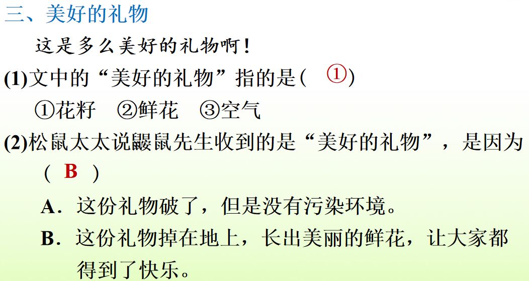 2. “这是多么美好的礼物啊”,“这”指的是( ) 为什么松鼠太太要这么说?
