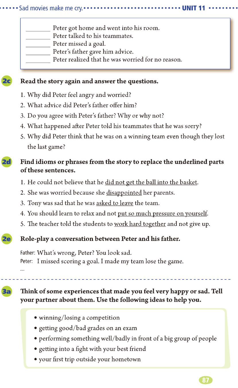 他一走进家门,他爸爸就问:“怎么了,儿子?”彼得的情绪都写在脸上。“我比赛输了。”彼得回答。然后,他不再说话走进了自己的卧室。十分钟后,彼得听见爸爸在敲卧室门,他打开房门让爸爸进来。