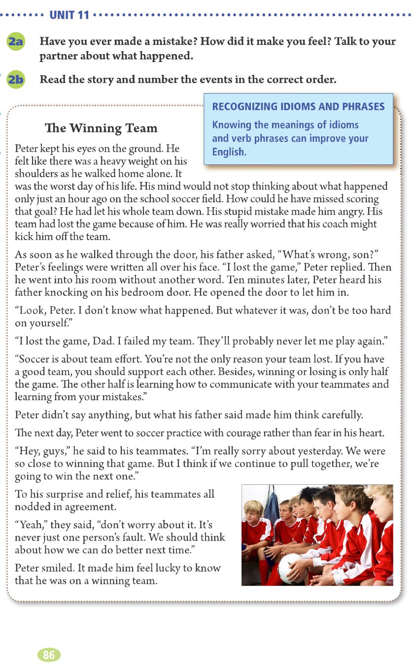 “我输球了,爸爸,我导致了球队的失败。很可能他们再也不会让我踢球了。”“足球是靠团队的集体努力,”你不是导致球队失利的唯一原因。如果你们是一只优秀的球队,你们应该互相支持。此外,输赢只是比赛的一半。另一半是学会怎样和队友合作,怎么样从错误中吸取教训。”