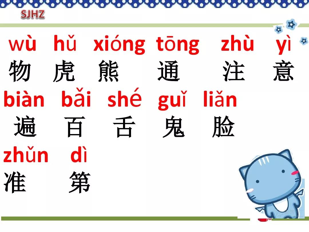 扫码查看下载全部资源精典往期一年级语文课程知识精讲汇总一年级数学课程知识精讲汇总部编一年级语文下全册朗读精讲识字1《春夏秋冬》图文精讲识字2《姓氏歌》图文精讲识字3《小青蛙》朗读精讲识字4《猜字谜》图文精讲口语交际:听故事,讲故事 知识精讲语文园地一 知识点精讲+习题第1课《吃水不忘挖井人》知识精讲第2课《我多想去看看》知识精讲第3课《一个接一个》知识精讲第4课《四个太阳》朗读精讲第5课《小公鸡和小鸭子》朗读精讲语文园地二 图文精讲+知识点第6课《树和喜鹊》朗读+精讲第7课《怎么都快乐》朗读精讲口语交际:请你帮个忙 知识精讲《语文园地三》朗读精讲第8课《静夜思》朗读精讲第9课《夜色》朗读精讲第10课《端午粽》朗读精讲第11课《彩虹》朗读精讲语文园地四 知识点精讲识字二5.动物儿歌 知识精讲识字二6《古对今》知识精讲识字二7《操场上》知识精讲识字二8《人之初》知识精讲口语交际:打电话语文园地五 知识精讲第12课《古诗二首》知识精讲第13课《荷叶圆圆》知识精讲第14课《要下雨了》知识精讲语文园地六 知识精讲第15课《文具的家》知识精讲第16课《一分钟》朗读精讲17 动物王国开大会 教学视频电子课本知识点一、笔画笔顺二、会写字及组词要(要求)(不要)(只要)(主要)(要好)连(连长)(连日)(连忙)(连队)百(百万)(百合)(百草)(百叶)还(归还)(还手)(还有)(还好)(还行)(还在)舌(舌头)(长舌)(学舌)(口舌)点(早点)(雨点)(点心)(点子)三、会认字及组词物wù(动物 )(生物) (物品) 虎hǔ(老虎) (白虎) (虎头) 熊xióng(黑熊) (熊猫) (狗熊) 通tōng(通过) (通车) (通道) 注zhù(注意) (注明) (注音) 意yì(意义) (意思) (心意) 遍biàn (一遍) (走遍) (遍地) 百bǎi(百日) (百合) (成百上千)舌shé(舌头) (舌尖) (口舌)鬼guǐ(小鬼) (鬼怪) (鬼神)脸liǎn(脸蛋) (洗脸) (脸皮)准zhǔn(准备) (准时) (准确)第dì(第一) (门第) (第几)四、多音字要yāo(要求) yào(不要)还huán(还手)hái(还有)五、易写错的字要:上下结构,上小下大,上头提醒学生不要写成西。连、还:半包围结构,先里后外,提醒学生“走之旁”三笔写成。百、 舌:注意间架结构,“百”第一笔、“舌”第二笔为长横。点:注意“四点底”第一个为左点,后三个为右点。六、近义词通知—告诉 清楚—明白 连忙—急忙 准时—按时 参加—参与 因为—由于七、反义词借—还 开—关 清楚—糊涂八、课后习题时间:本周五早上八点。地点:教学口门前。参加人:各班同学。事情:参加运动会入场式。通知人:少先队大队部。通知时间:2016年4月20日九、教材分析《动物王国开大会》是部编版新教材第二册第十七课。这是一篇童话故事。童话是儿童文学的一种,通过丰富的想象、幻想和夸张来塑造艺术形象,反映生活,增进儿童思想性格的成长。这篇童话故事情节反复,内容和表现形式浅显生动,对动物的的描写采用拟人化的手法,能适应儿童的接受能力。”《动物王国开大会》课文讲了动物王国要开大会,老虎让狗熊通知,狗熊在狐狸、大灰狼、梅花鹿的提醒下,一次又一次才把通知说清楚。通过狗熊四次播报通知,让学生明白发布通知时要把重要的内容说清楚、说完整。图文解读同步练习:一、将下列汉字与对应的声母连一连。熊 b遍 x脸 d第 l二、选择横线字的正确读音,画“√”。注意(zhù zù) 鬼脸(ɡuǐ ɡuì)动物(wū wù) 准备(zǔn zhǔn)三、看拼音,写汉字。 lián bǎi1.( )续跳一( )次是我的目标。 shé hái2.她( )头疼得厉害,但( )在不停地吃东西。 四、我来扩词。点( ) ( ) ( )连( ) ( ) ( )五、选字填空。(填序号)①第 ②弟1.我的表( )喜欢跳舞。2.这次比赛我们班又得了( )一名。六、按要求写句子。1.连词成句。(1)狗熊 大声喊 用喇叭___________________________________(2)奔来 问狗熊 梅花鹿___________________________________2.照样子,写句子。例:我怎么没问清楚呢?他怎么______________________________七、读一读,写一写。 通 知 明天早上九点,请参加少先队大队部会议的各班班长,准时到校大队部活动室参加关于开展“节约每一滴水”的倡议活动。 少先队大队部 2018年5月14日时间:______________________地点:______________________参加人:____________________通知单位:__________________事情:______________________参考答案一、熊-x 遍-b 脸-l 第-d二、zhù ɡuǐ wù zhǔn三、1.连 百 2.舌 还四、点头 面点 小数点 连续 连线 连接五、1.② 2.①六、1.(1)狗熊用喇叭大声喊。 (2)梅花鹿奔来问狗熊。 2.不吃早饭呢?七、时间:明天早上九点(2016年4月21日) 地点:校大队部活动室 参加人:参加少先队大队部会议的各班班长 通知单位:少先队大队部 事情:参加关于开展“节约每一滴水”的倡议活动往期精彩推荐●部编一年级语文下册●【知识点及朗读精讲】部编一年级语文下全册朗读精讲部编一年级语文下册教材全解读部编一年级语文下册优质课堂实录精选部编一年级语文下册全册知识要点大归纳【字词句】部编一年级语文下册生字练字帖部编一年级语文下全册生字扩词部编一年级语文下册生字描红字帖部编一年级语文下全册一类字组词部编一年级语文下全册看拼音写词语部编一年级语文下册期中必考字词句部编一年级语文下册生字教学+生字表部编一年级语文全册多音字组词及造句!部编一年级语文下整册生字组词、近反义词、成语大全部编一年级语文下册生字
