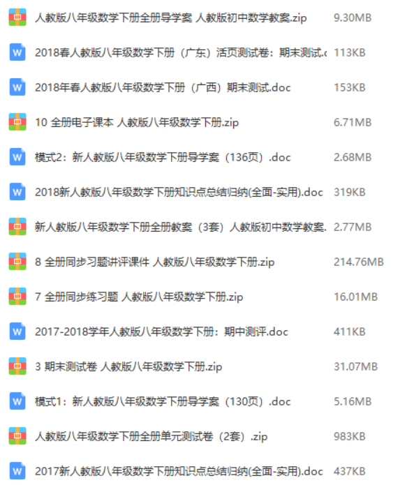 扫码查看下载全部资源全册图文视频讲解第十六章 二次根式16.1 【二次根式】16.2【二次根式的乘除】16.3【二次根式的加减】第十七章 勾股定理17.1 【勾股定理】17.2 【勾股定理的逆定理】第十八章 平行四边形18.1【平行四边形】18.2【特殊的平行四边形】第十九章 一次函数19.1【函数】19.2【一次函数】19.3【课题学习 选择方案】第二十章 数据的分析20.1【数据的集中趋势】20.2【数据的波动程度】20.3课题学习【体质健康测试中的数据分析】全册教学资料全册教案下载全册知识点整理全册知识点精讲+资料期末复习资料课件打包下载各单元试卷全套及答案解析全册知识点汇总+期末测试卷微课教学第十六章 二次根式16.1 二次根式16.2 二次根式的乘除16.3 二次根式的加减第十七章 勾股定理17.1 勾股定理阅读与思考 勾股定理的证明17.2 勾股定理的逆定理第十八章 平行四边形18.1 平行四边形18.2 特殊的平行四边形第十九章 一次函数19.1 函数19.2 一次函数19.3 课题学习 选择方案第二十章 数据的分析20.1 数据的集中趋势20.2 数据的波动程度20.3 课题学习 体质健康测试中的数据分析压缩文件包预览↓↓下载完整WORD电子版请扫码关注班班通教学系统公众号发送消息【人教版八年级数学下册】这10个关键字获取 ▼长按关注图文来自网络,版权归原作者,如有不妥,告知即删点击阅读原文下载全册PPT课件动画教案习题朗读试卷电子课本整套资料