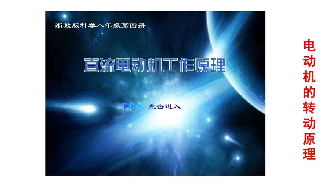 扫码查看下载全部资源初中物理8-9年级微课精讲+课件教案下载初中物理8-9年级全册教案Word文档打包下载教师做PPT课件需要插入的视频动画,从这里下载mp4↓视频教学:重点知识:1.当线圈在下图位置时,通过线圈ab、cd两边的电流方向相反,两边受到大小相等、方向相反的力。由于两个力不在同一条直线上,所以线圈框会顺时针转动。2.当线圈转到下图位置时,线圈ab、cd两边受到的力大小相等、方向相反,并且作用在同一条直线上了,两个力彼此平衡,我们把此位置称为平衡位置。由于线圈具有惯性,会转过平衡位置继续顺时针转动。3.线圈转过平衡位置后,线圈ab、cd两边受力大小、方向不变,但不在同一条直线上了,如下图所示。因此,两个力会阻碍线圈继续顺时针转动,转过一定角度后又开始逆时针转动。所以,线圈会在平衡位置来回摆动,最终停在平衡位置。1平衡位置通电线圈的平面与磁感线垂直时,线圈受到磁场的作用力相互平衡,我们把这个位置称为平衡位置。2换向器在直流电动机中,改变电流方向的元件叫做换向器,它是由两个电刷和两个半环组成的,每当线圈刚转过平衡位置时,换向器就能自动改变线圈中电流的方向。换向器3电动机原理科学家利用了通电导线在磁场中受到力的作用的原理制成了电动机,电动机的发明推动了生产生活的大发展,下面我们通过一个视频详细来了解一下电动机的工作原理:电动机的原理4电动机的应用电动机是将电能转化成机械能,在日常的生产生活中有着十分广泛的应用。高铁、动车、电力机车、地铁、轻轨、机床、水泵、电梯、电钻、电脑、洗衣机、电风扇、冰箱、电动剃须刀、电动门、电动玩具等等,都用到了电动机。精品课件:教案:一、知识与技能1.知道磁场对通电导体有作用力.知道通电导体在磁场中受力的方向与电流方向和磁场方向有关.2.知道通电线圈在磁场中转动的道理.知道通电导体和通电线圈在磁场中受力而运动,是消耗了电能,得到了机械能.3.学会安装和制作简单的电动机.4.培养学生观察能力和推理、归纳、概括物理知识的能力.二、过程与方法1.探究磁场对电流的作用的过程.2.分析直流电动机的主要结构和工作原理.三、情感态度与价值观1.让学生通过亲自的实验探究,体验科学研究基本方法,培养学生科学探究的意识.2.通过了解物理知识转化成为实际技术的过程,进一步提高学习科学知识的兴趣.3.初步培养创造发明意识.【重点难点】 重点:磁场对通电导体有力的作用,及其作用力的方向与磁场方向和电流的关系.难点:电动机的工作原理. 【新课导入】 导入1: 问题导入复习并猜想:磁体的周围存在着磁场,电流的周围也存在着磁场;磁场最基本的性质是对磁场中的磁体产生磁力作用,那么磁场对磁场中的电流也应该产生力的作用.导入2: 情境导入教师展示: 生活中的电动机问题:电流通过电动机,电动机的轴就转动起来,电动机通电后转动的原理是什么?【课堂探究】 将电动机的核心要件的工作简化为一个通电导体在磁场中的运动进行深入探究。1.磁场对电流的作用演示课本图1725实验 :(1)当接通电源时,我们看到金属杆运动起来.(2)将电流方向改变,发现金属杆运动方向发生改变.(3)保持电流方向不变,将U形磁铁磁极对调,发现金属杆运动方向发生改变.[来源:Zxxk.Com](4)通过观察比较,分析得出的结论填写下列内容:磁场对通电导体具有 力 的作用,其作用的方向与 磁场方向 、 电流方向 有关. 2.电动机是怎样转动的?(1)原理:磁场对通电导体的力的作用演示自制的小小电动机(线圈为漆包线)A.往复运动(漆包线为两侧的漆都刮去) B.持续不断的向前运动(一侧的漆全部刮去,另外一侧只刮去一半)(2)电动机的构造教师展示电动机实物和图片,让学生预习后指图回答:直流电动机的主要组成部分有 线圈 、 磁极 和 换向器 ,其中 换向器 的作用是在线圈转到平衡位置时使电流的方向发生改变. (2)展示1726“电动机的工作原理”ppt,引导学生分析: ①通电时图中ab边和cd边都在磁场中,都要受力,因为电流方向相反,所以受力方向也 相反 . [来源:学科网ZXXK]②仔细观察四图说出换向器的作用是什么?换向器的作用是 在线圈转到平衡位置时使电流的方向发生改变,从而改变线圈受力方向,使线圈持续转动 . 播放视频:直流电动机的工作原理③电动机的原理: 通电线圈在磁场中受力转动 . ④电动机工作时,能的转化是 电能转化为机械能 . 练习:1.如左下图所示实验装置是用来研究____(选填“电流磁效应”或“磁场对通电导线的作用”)的。实验中把导线ab放在磁场里,接通电源,让电流通过导线ab,会观察到导线向右运动;如果把电源正、负极对调后接入电路,会观察到导线ab向____(选填“左”或“右”)运动;如果不对调电源正、负极,但把蹄形磁体上下磁极调换一下,会观察到导线ab向____(选填“左”或“右”)运动;如果把电源正、负极对调,同时把蹄形磁体上下磁极也调换一下,则会观察到导线ab向____(选填“左”或“右”)运动。 2. 如右上图为我们实验室所用电流表的内部结构示意图。当接入电路,有电流通过线圈时,线圈带动指针偏转。该电流表的工作原理是_ _。3. 如图所示四个实验现象中,揭示了电动机原理的是( ) 4. 我们使用的电风扇、洗衣机、抽油烟机等家用电器,其主要部件都是用电动机来工作的,那么电动机是根据下列哪种现象