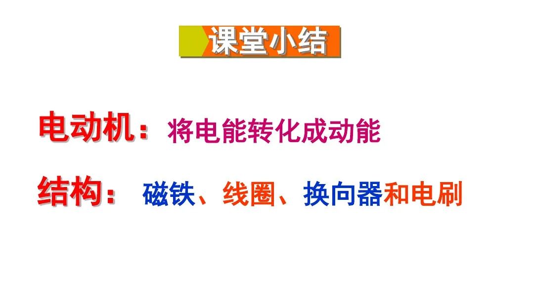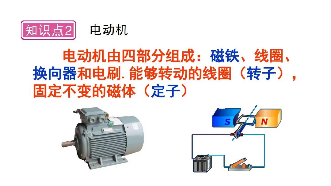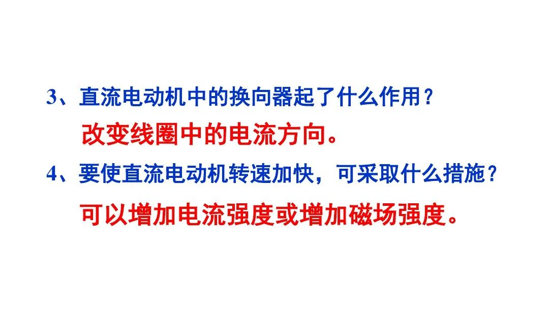 教师展示电动机实物和图片,让学生预习后指图回答:直流电动机的主要组成部分有 线圈 、 磁极 和 换向器 ,其中 换向器 的作用是在线圈转到平衡位置时使电流的方向发生改变.
