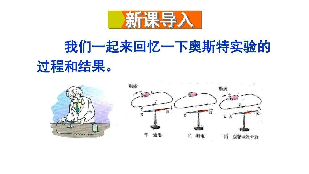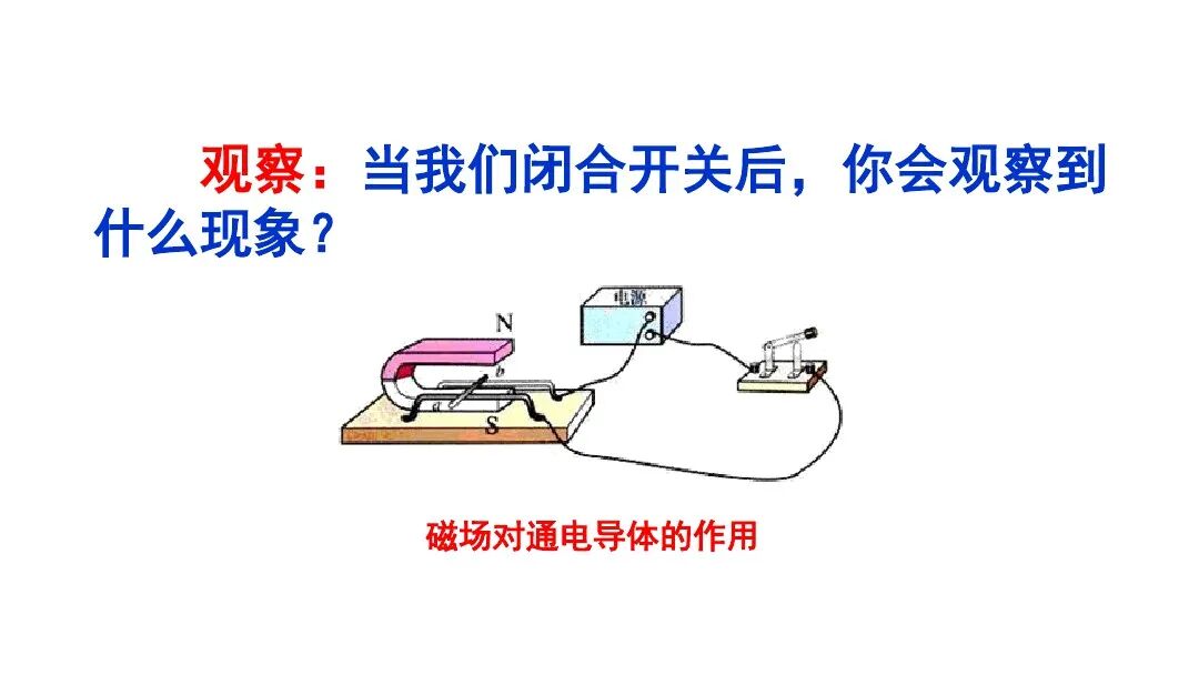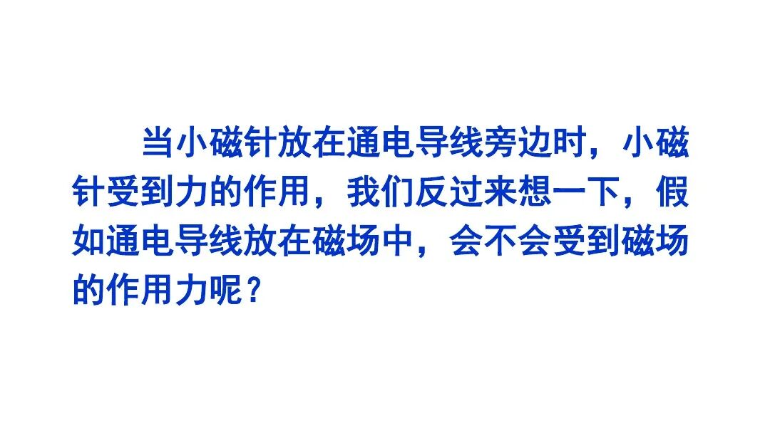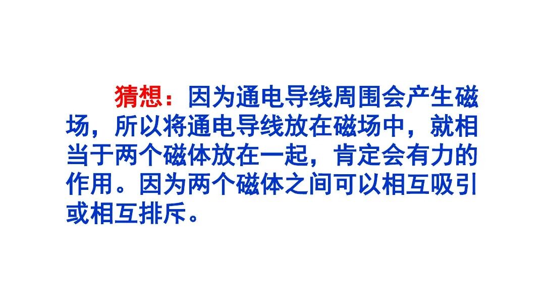 复习并猜想:磁体的周围存在着磁场,电流的周围也存在着磁场;磁场最基本的性质是对磁场中的磁体产生磁力作用,那么磁场对磁场中的电流也应该产生力的作用.