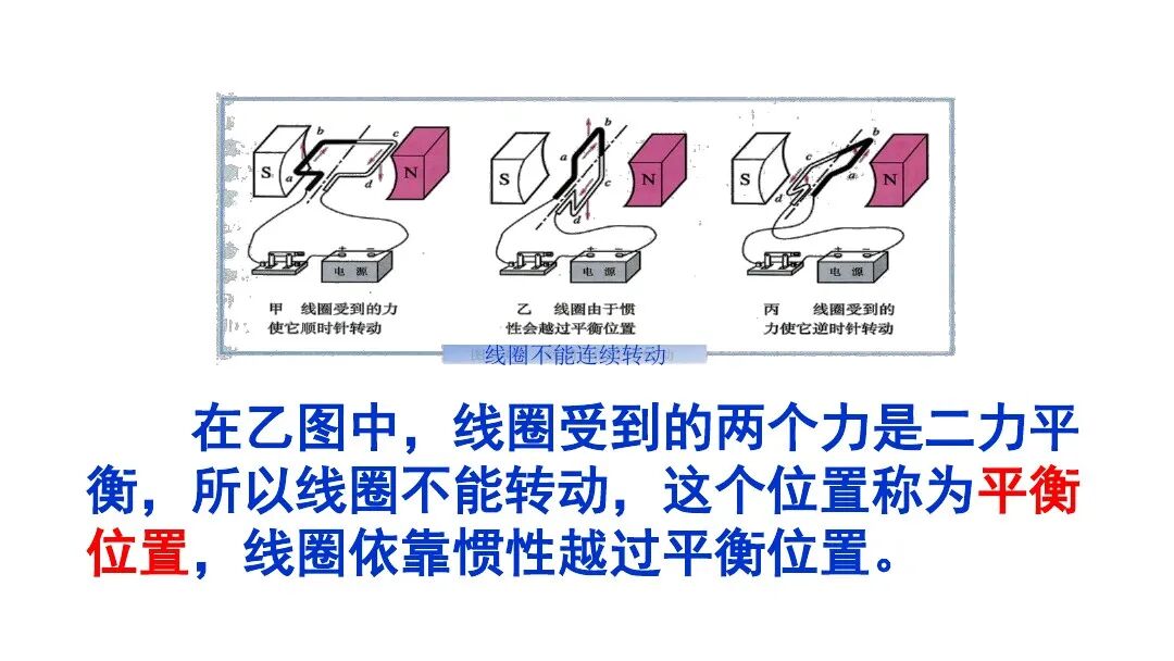 2.当线圈转到下图位置时,线圈ab、cd两边受到的力大小相等、方向相反,并且作用在同一条直线上了,两个力彼此平衡,我们把此位置称为平衡位置。由于线圈具有惯性,会转过平衡位置继续顺时针转动。