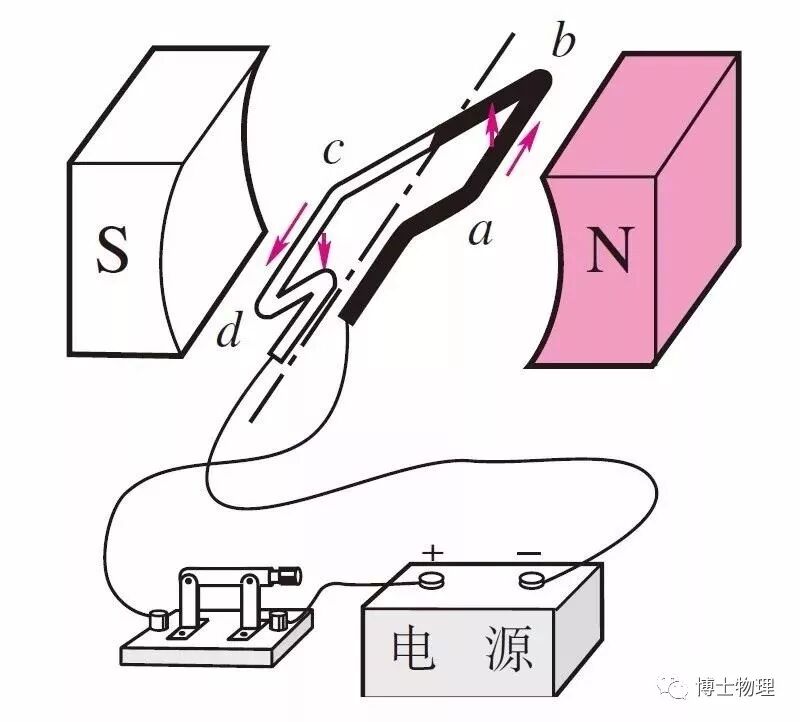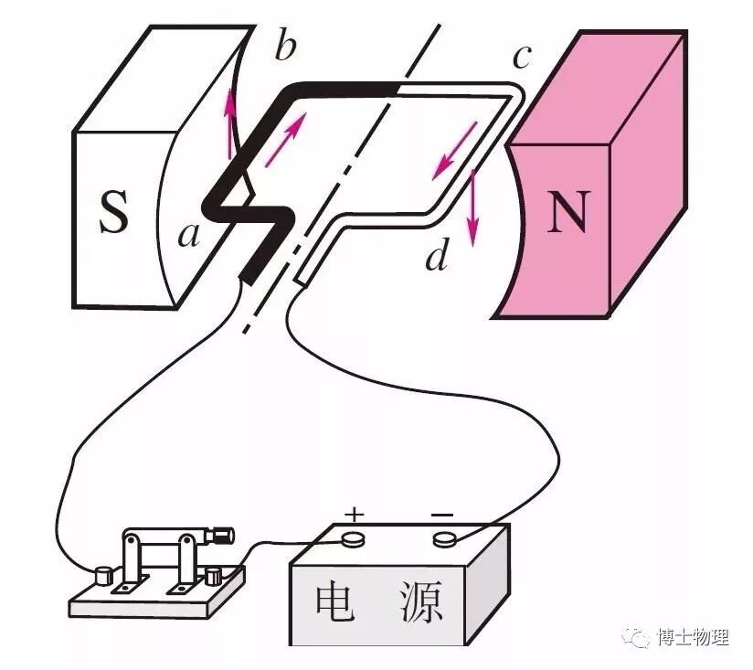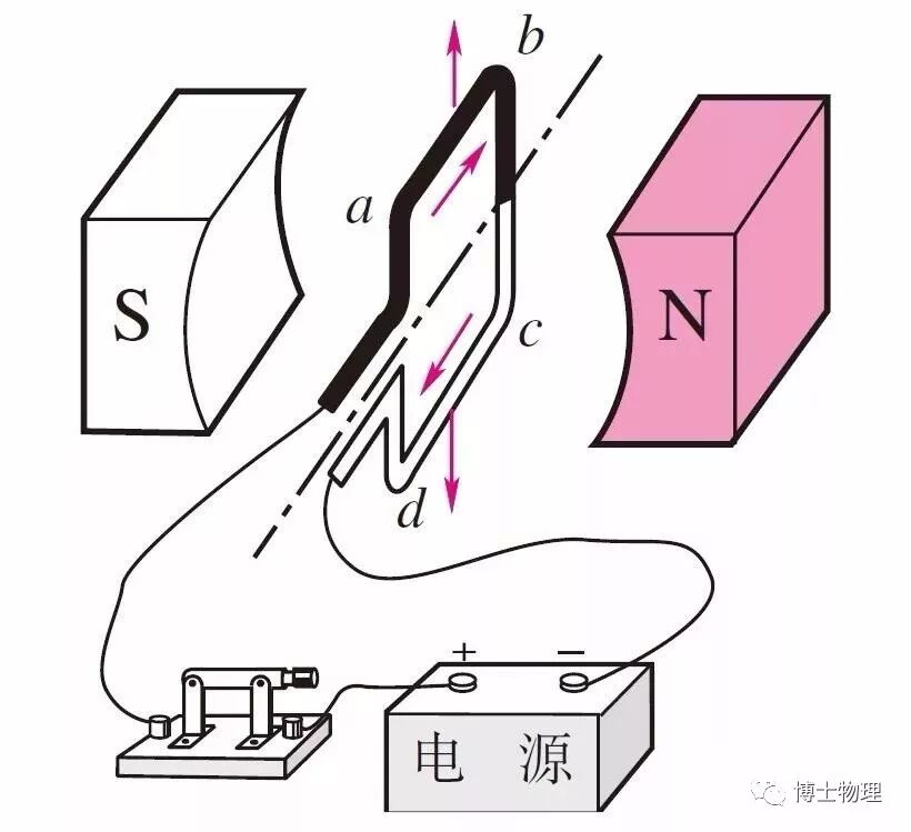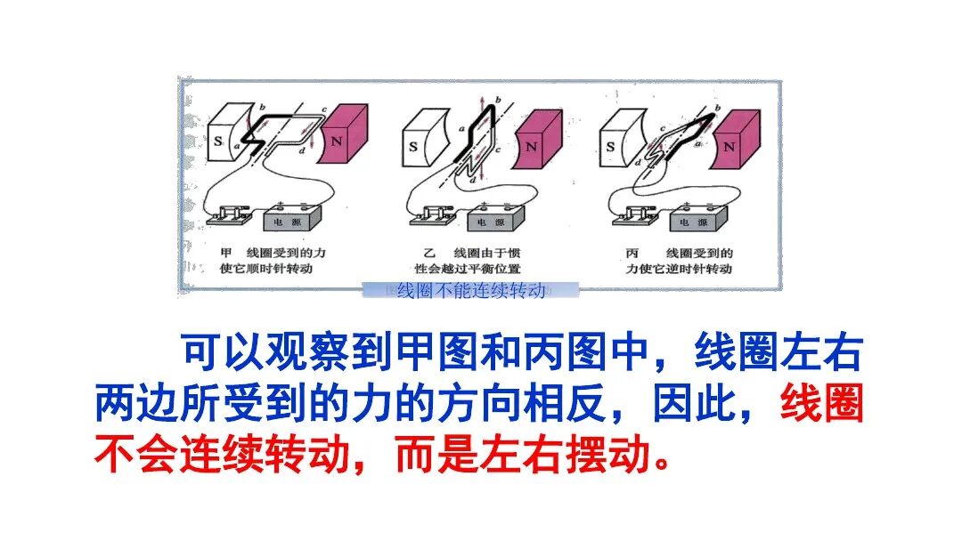 1.当线圈在下图位置时,通过线圈ab、cd两边的电流方向相反,两边受到大小相等、方向相反的力。由于两个力不在同一条直线上,所以线圈框会顺时针转动。