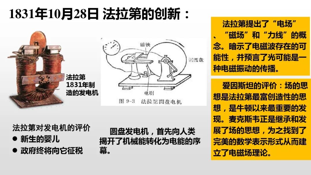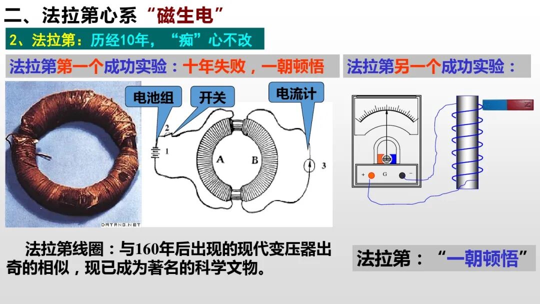 1820年奥斯特发现电流的磁效应,受到科学界的关注,促进了科学的发展。1821年英国《哲学年鉴》的主编约请戴维撰写一篇文章,评述奥斯特发现以来电磁学实验的理论发展概况。戴维把这一工作交给了法拉第。法拉第在收集资料的过程中,对电磁现象的研究产生了极大的热情,并开始转向电磁学的研究。他仔细地分析了电流的磁效应等现象,认为既然电流能产生磁,磁能否产生电呢?1822年他在日记中写下了自己的思想:“磁能转化成电”。他在这方面进行了系统的研究。起初,他试图用强磁铁靠近闭合导线或用强电流使另一闭合导线中产生电流,做了大量的实验,都失败了。经过历时十年的失败、再试验,直到1831年8月29日才取得成功。他接连又做了几十个这类实验。1831年11月24日的论文中,他把产生感应电流的情况概括成五类:变化着的电流;变化着的磁场;运动的恒定电流;运动的磁场;在磁场中运动的导体。他指出:感应电流与原电流的变化有关,而不是与原电流本身有关。他将这一现象与导体上的静电感应类比,把它取名为“电磁感应”。为了解释电磁感应现象,法拉第曾提出过“电张力”的概念。后来在考虑了电磁感应的各种情况后,认为可以把感应电流的产生归因于导体“切割磁力线”。在电磁感应现象发现二十年后,直到1851年才得出了电磁感应定律。经过大量实验后,他终于实现了“磁生电”的夙愿,宣告了电气时代的到来。
