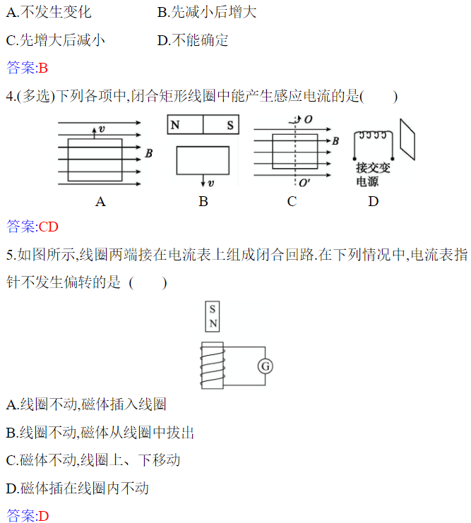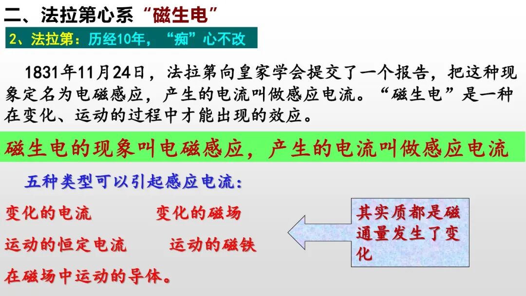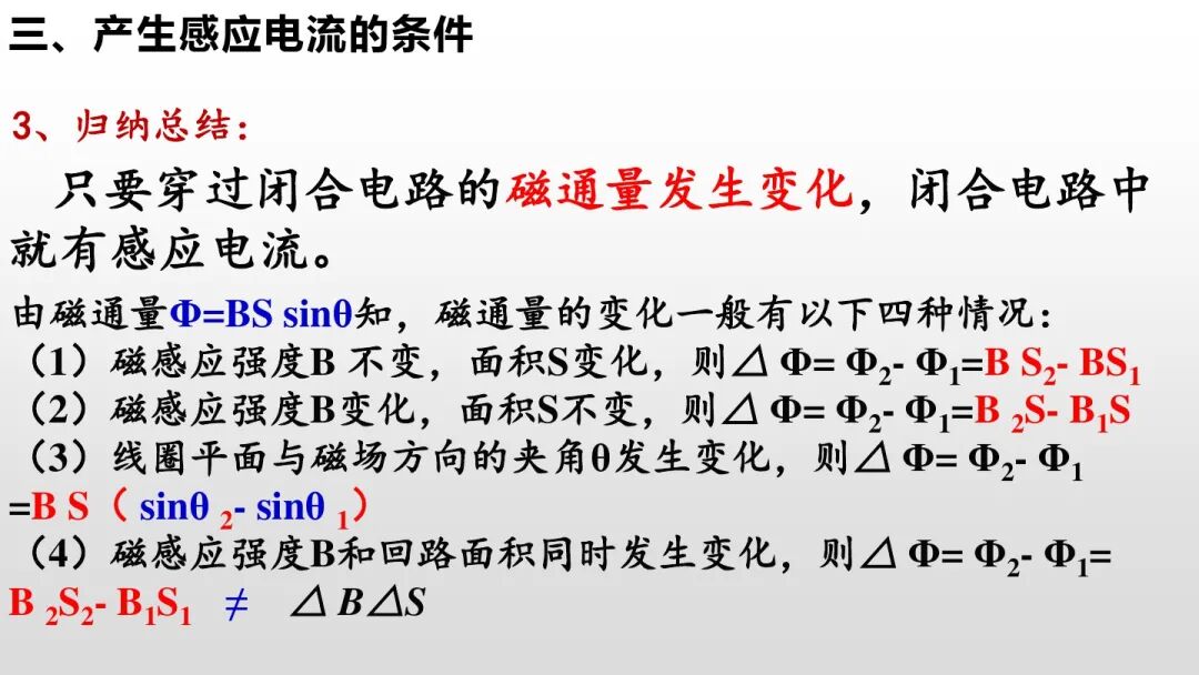 不论用什么方法,只要穿过闭合电路的磁通量发生变化,闭合电路中就有电流产生。这种利用磁场产生电流的现象叫电磁感应,产生的电流叫感应电流。