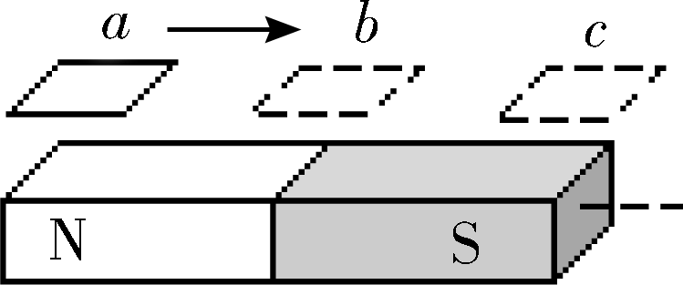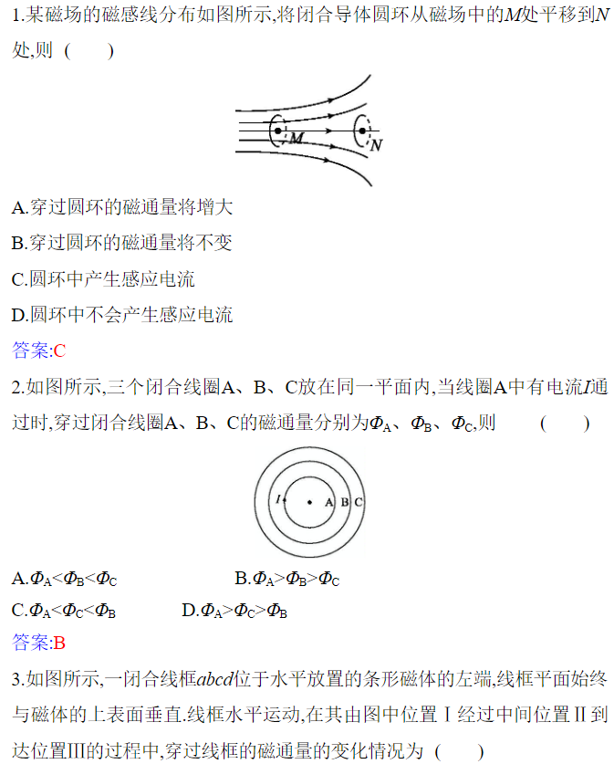 ①如图所示,矩形线圈沿a →b →c在条形磁铁附近移动,试判断穿过线圈的磁通量如何变化?