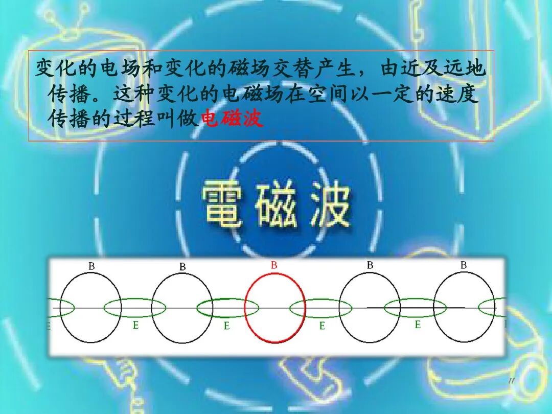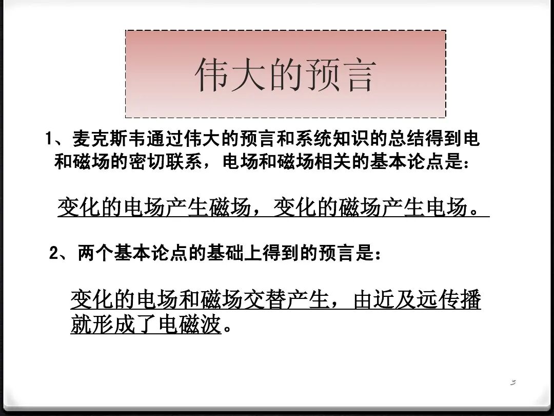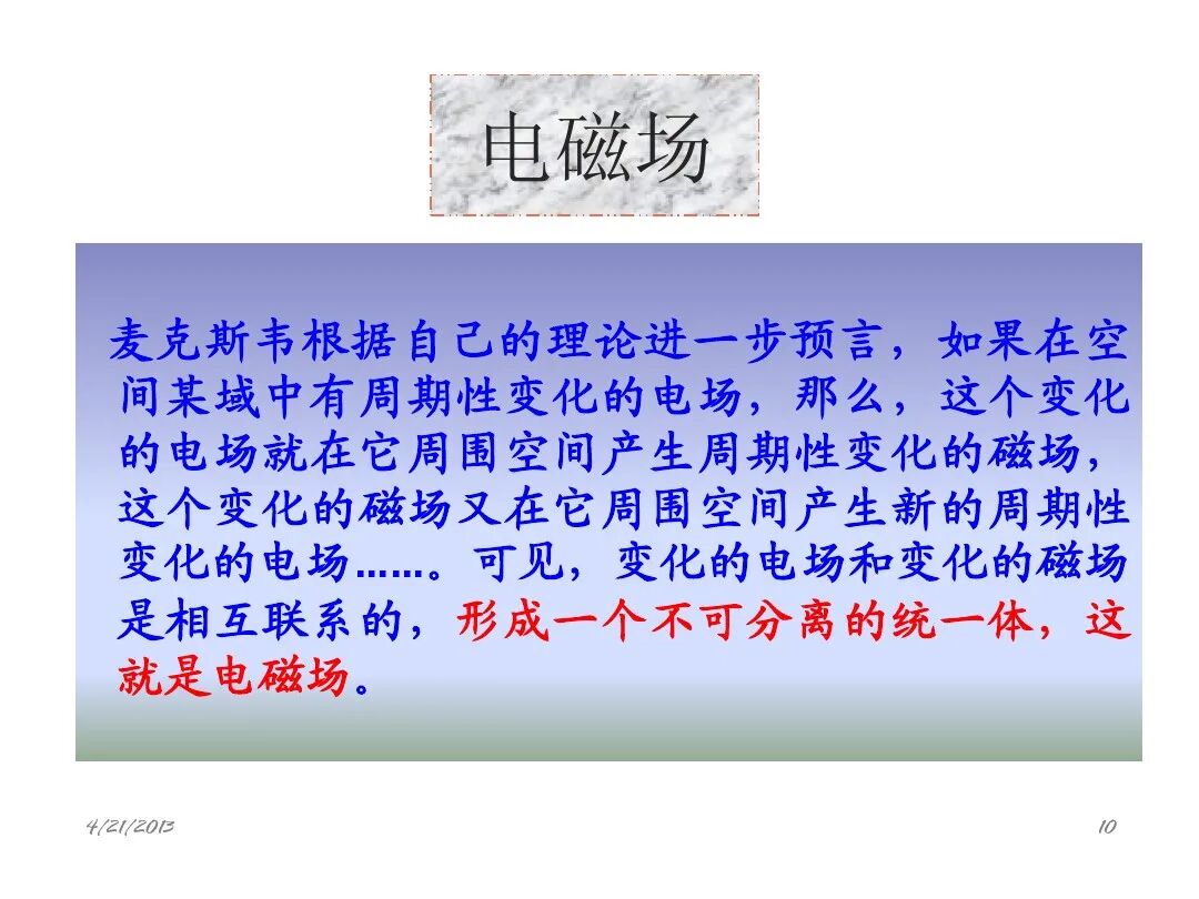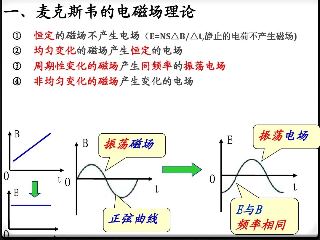 如果在空间某处有周期性变化的电场,那么这个变化的电场就在它周围空间产生周期性变化的磁场,这个变化的磁场又在它周围空间产生变化的电场——变化的电场和变化的磁场是相互联系着的,形成不可分割的统一体,这就是电磁场.