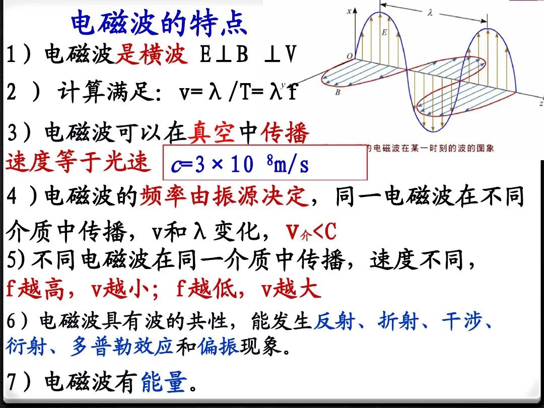 (2)电磁波是横波.在电磁波中,每处的电场强度和磁感应强度方向总是互相垂直的,并且都跟那里的电磁波的传播方向垂直.