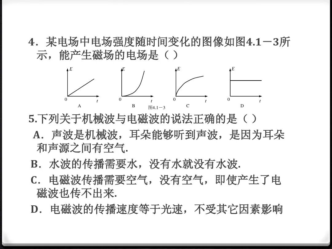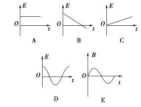 ABC[由麦克斯韦电磁场理论,当空间出现恒定的电场时(如A图),由于它不激发磁场,故无电磁波产生;当出现均匀变化的电场(如B图、C图时),会激发出磁场,但磁场恒定,不会在较远处激发出电场,故也不会产生电磁波;只有周期性变化的电场(如D、E图),才会激发出周期性变化的磁场,它又激发出周期性变化的电场……如此不断激发,便会形成电磁波.]