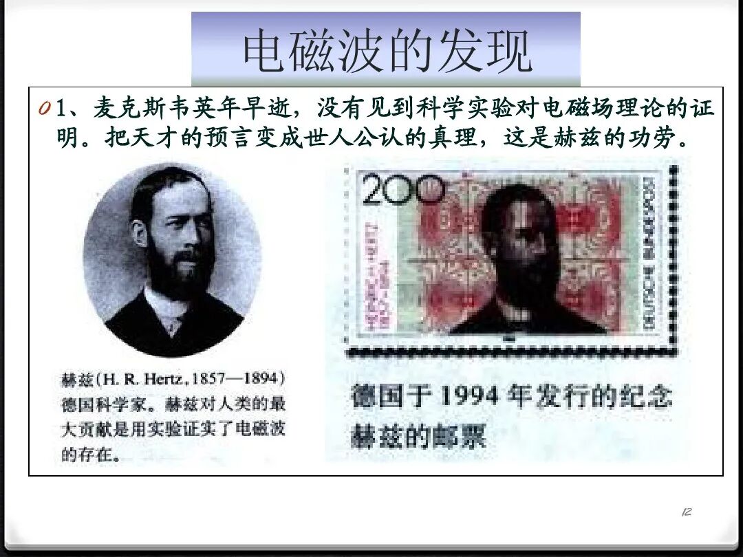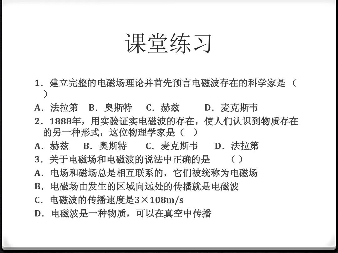 赫兹观察到了电磁波的反射、折射、干涉、偏振和衍射等现象.测量证明了电磁波在真空中具有与光相同的速度c,证实了麦克斯韦关于光的电磁场理论.