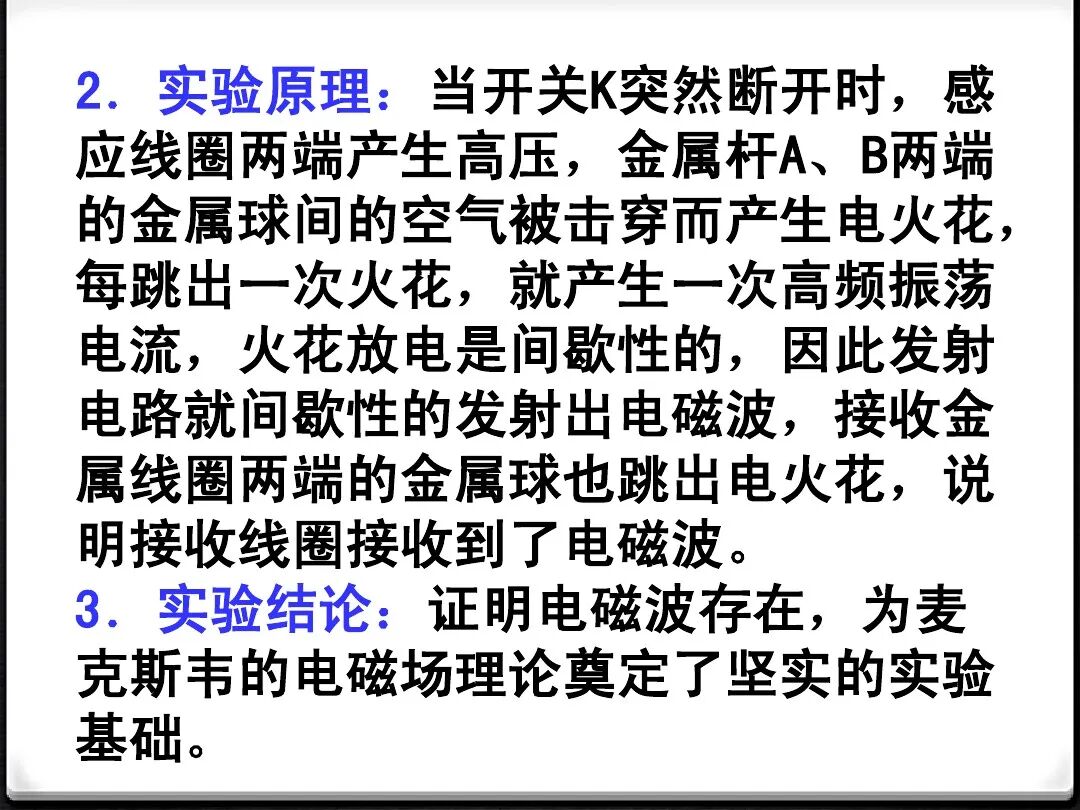 结论:赫兹实验证实了电磁波的存在,检验了麦克斯韦电磁场理论的正确性.