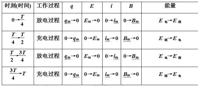 在LC振荡回路发生电磁振荡的过程中,电容器上的物理量:电量q、电场强度E、电场能EE是同步变化的,即:
